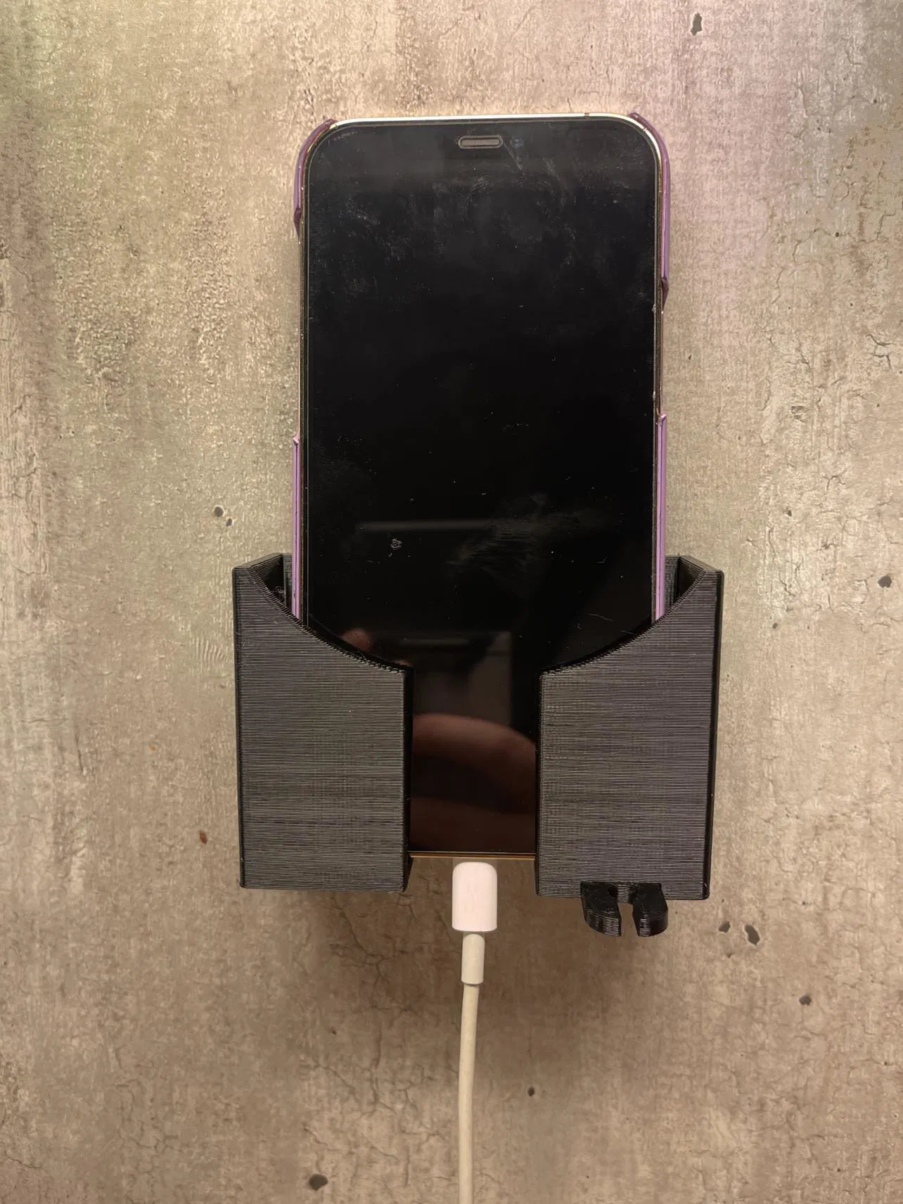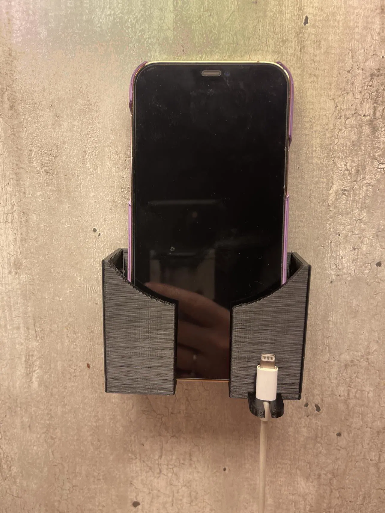 Giá đỡ điện thoại gắn tường cơ bản, có khoét lỗ để sạc và giữ dây cáp.
