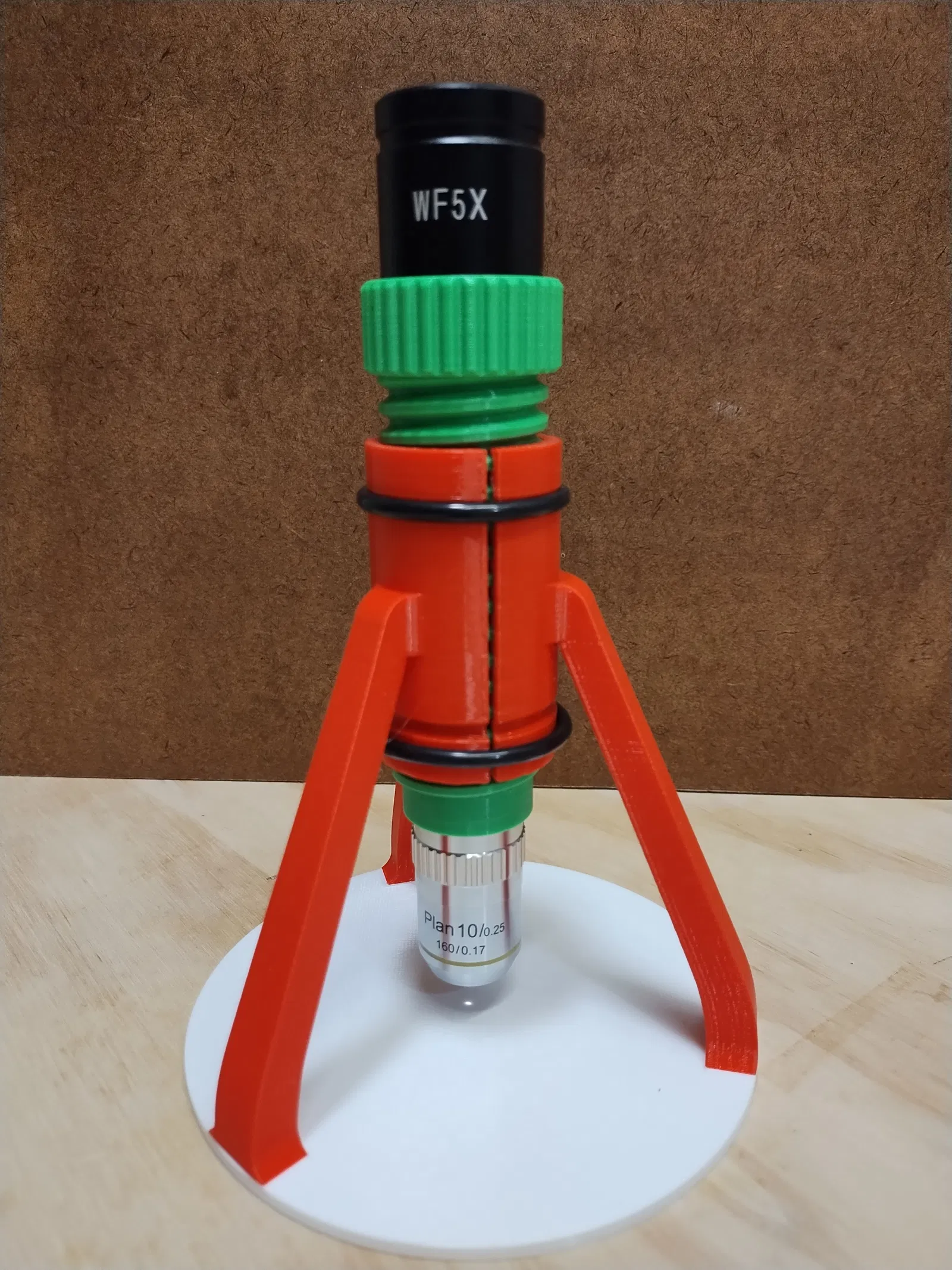 Đây là bản cập nhật (25 tháng 7 năm 2025) cho thiết kế ban đầu của tôi, vốn có nhiều chuyển động của trường nhìn do độ rơ giữa ống kính và chân đế cũng như sự rung lắc của chân đế cổ ngỗng truyền thống. Độ rơ giữa ống kính và chân đế đã được giảm bớt bằng cách thêm một khe vào bộ giữ ống kính và sử dụng dây đai nén. Độ cứng đã được tăng cường bằng cách sử dụng chân đế ba chân. Một núm xoay đã được thêm vào ống kính để hỗ trợ lấy nét. Kính hiển vi chấp nhận các ống kính tiêu chuẩn có ren RMS và kính ngắm tiêu chuẩn 23,2 mm.