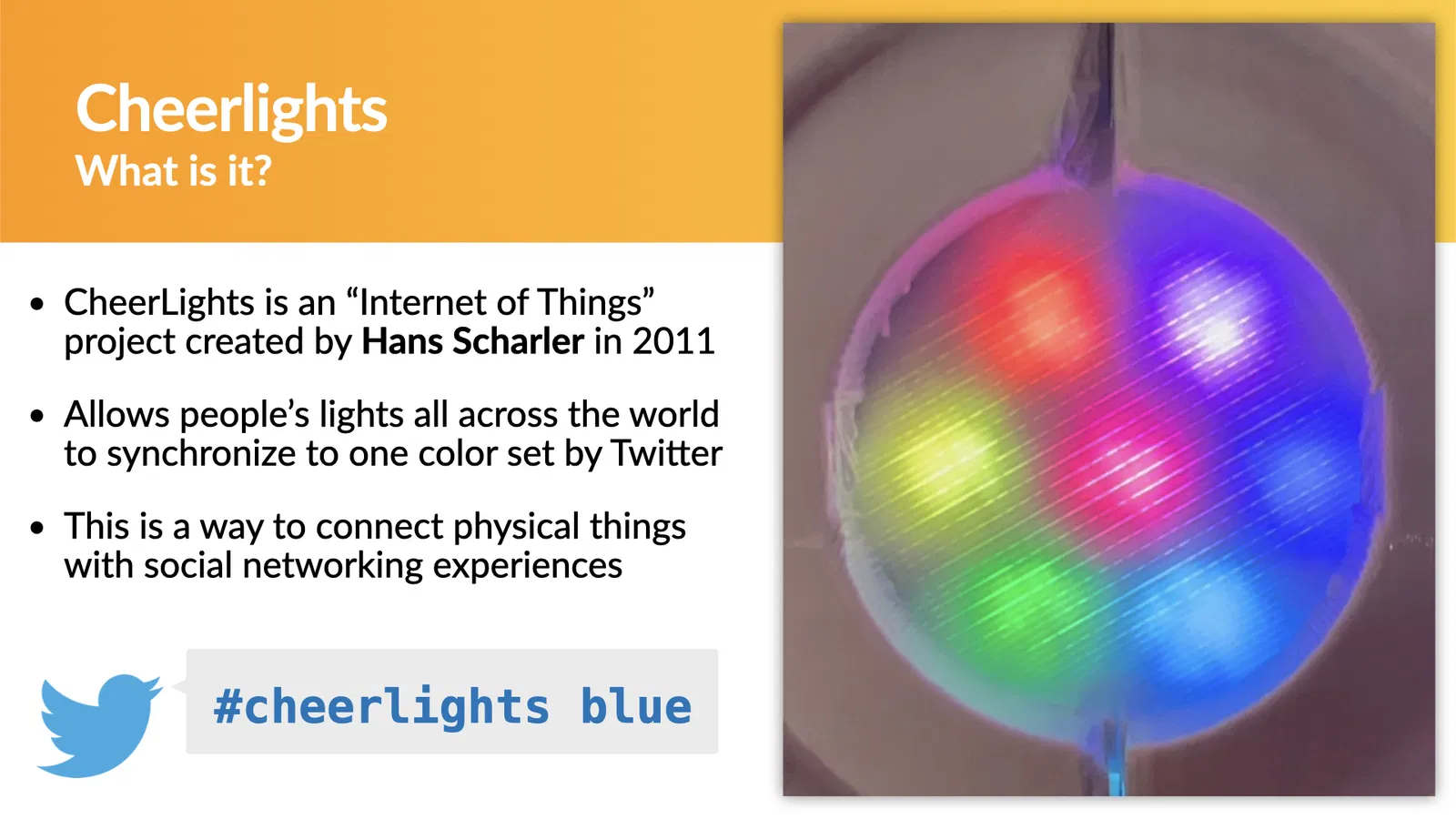 - CheerLights là một dự án “Internet of Things” được tạo ra bởi Hans Scharler vào năm 2011