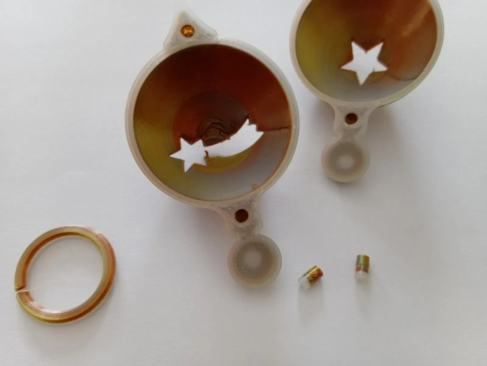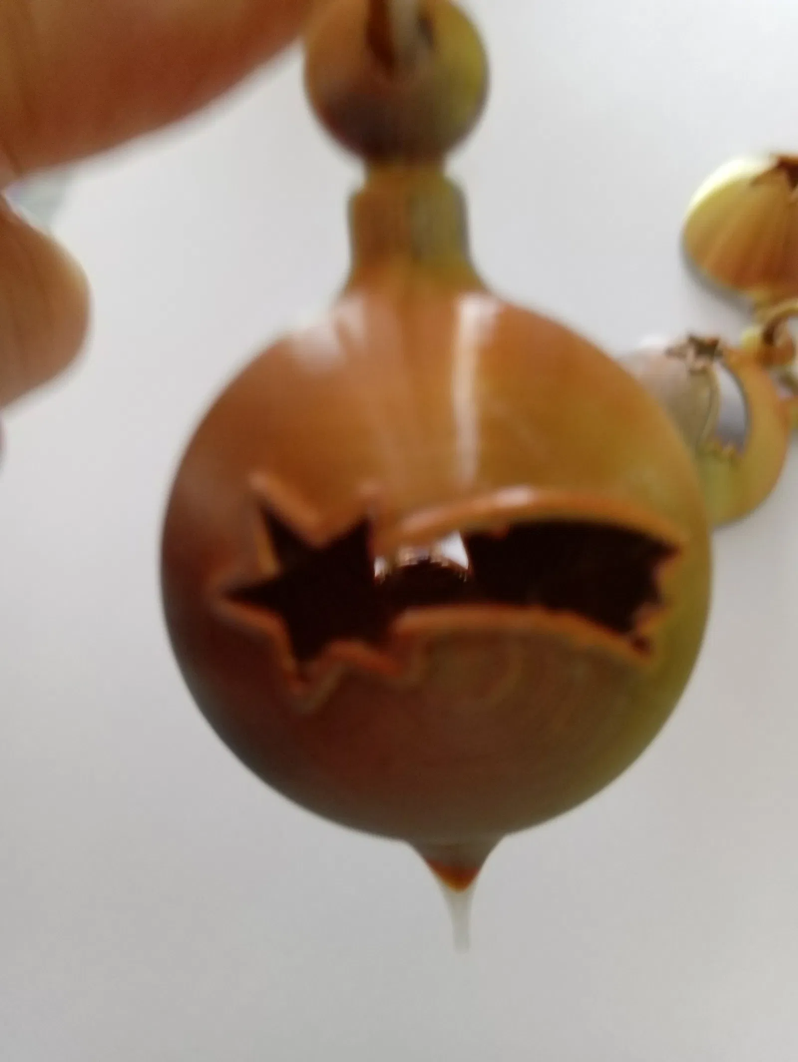 Cái này là quả cầu Giáng sinh được in từ sợi PLA nhiều màu, không cần dùng support luôn nha. Nó gồm 5 mảnh, sau khi in xong thì mấy cái chốt nối ở mặt tiếp xúc với bàn in mình cứ gá vô lỗ trên nửa quả cầu rồi ghép hai nửa lại là xong, gắn thêm cái khoen treo nữa là đẹp!
