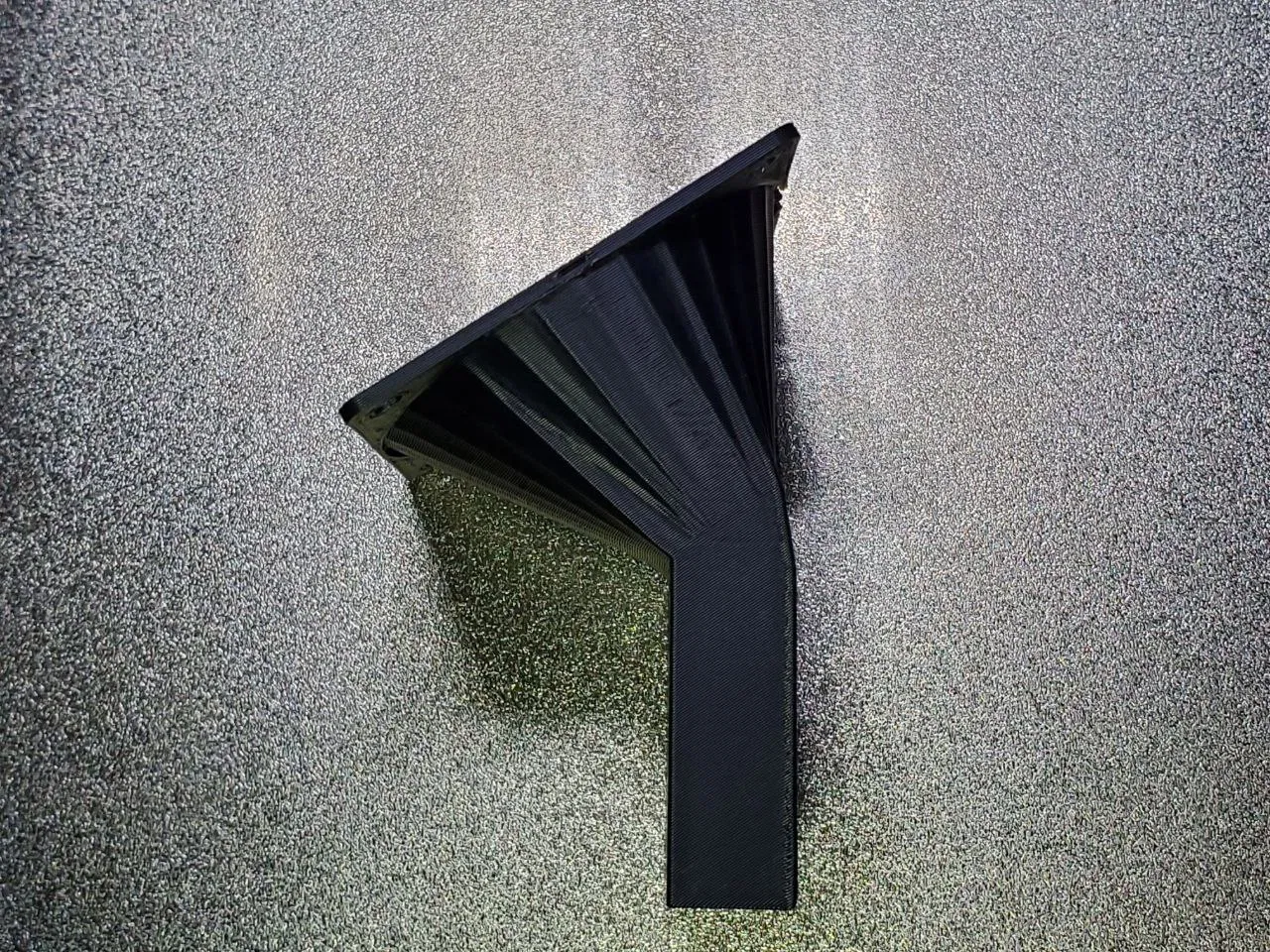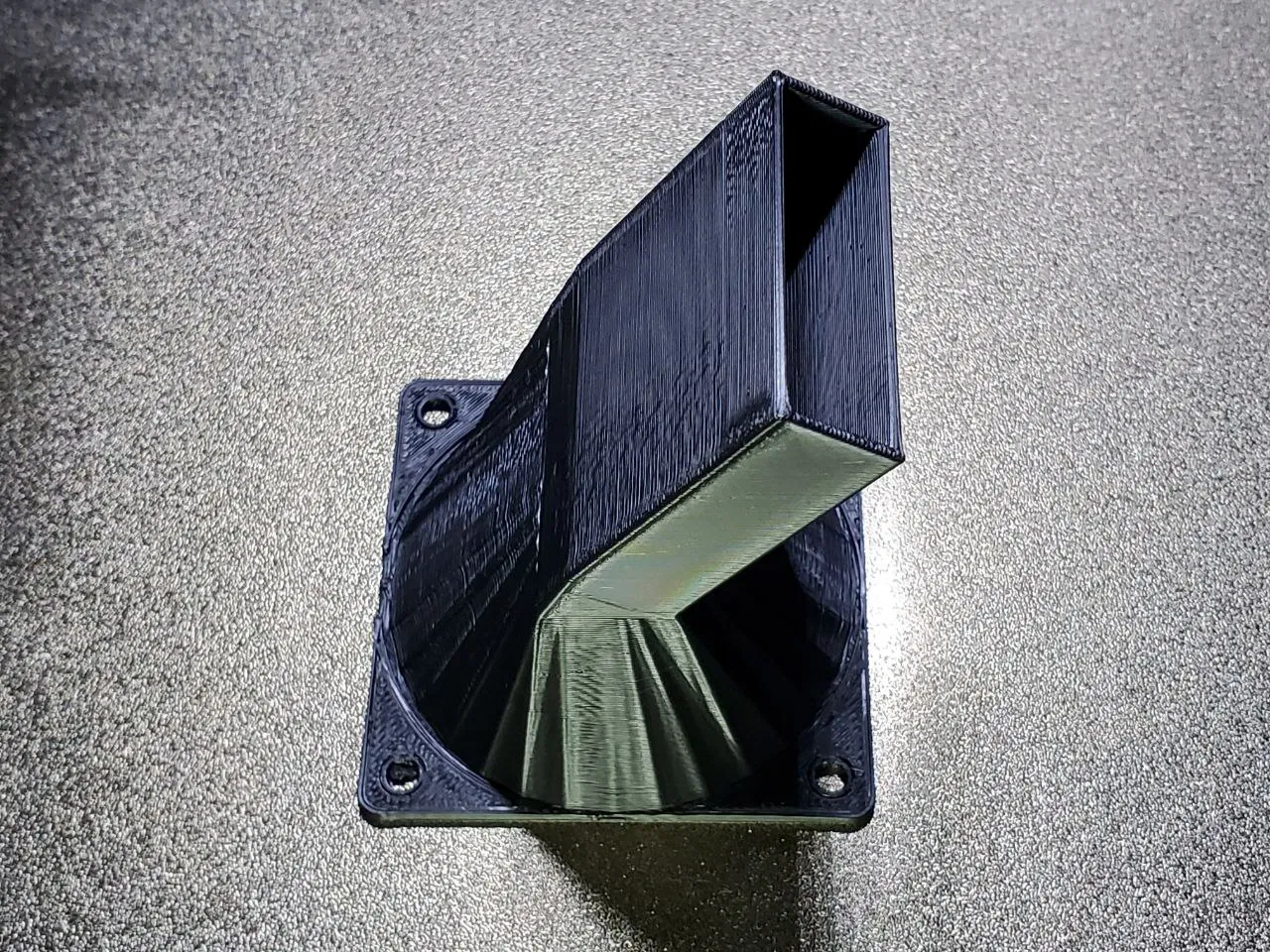Vì vậy, tôi đã thử nghiệm bằng cách chỉnh sửa và sửa đổi một vài mẫu ống dẫn và bộ chuyển đổi để xem quạt 60mm hoạt động như thế nào và kết quả rất tuyệt vời, nhưng trông hơi cồng kềnh. Sau đó, tôi đã khám phá Blender và tạo ra một mô hình mới với luồng khí được tối ưu hóa tốt hơn. Nó chuyển đổi lỗ tròn 60mm thành đầu ra 40mmX15mm với thành dày 2mm và góc nghiêng luồng khí được giảm bớt.
