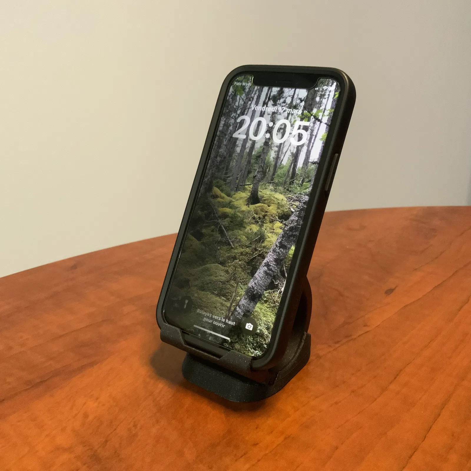 Giá đỡ điện thoại hình bánh răng có thể điều chỉnh. Phù hợp cho điện thoại hoặc máy tính bảng dày tới 14mm. Dễ dàng thay đổi kích thước, góc nghiêng có thể điều chỉnh. Sử dụng cài đặt Prusa Slicer mặc định với PLA hoặc PETG, 3 viền. Phiên bản v2 có khe hở phía trước và đế lớn hơn, ổn định hơn.