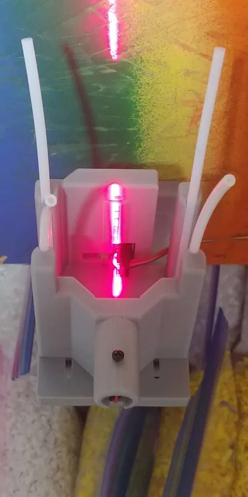 Để cố gắng làm cho ProperWinder (link bên dưới) chạy với tốc độ ổn định hơn, tôi đã chỉnh sửa bộ cảm biến laser gắn tường (cũng của universaljoint) sao cho laser và cảm biến nằm chung trên một bộ phận, sau đó di chuyển trên giá đỡ của nó. Với cách này, sợi filament không thể đi quá gần laser, tạo ra một bóng lớn trên một khoảng chuyển động nhỏ. Giờ đây, sợi filament có thể đi gần cảm biến hơn và cách xa laser hơn. Toàn bộ bộ phận cũng có thể di chuyển gần hơn hoặc xa hơn khỏi tường nơi nó được gắn, bởi vì tôi đã sử dụng thiết kế ống dẫn PTFE (cũng được bao gồm ở đây) từ ProperWinder. Tôi cũng đã thêm một số sửa đổi khác để kết nối laser với bảng điều khiển cảm biến dễ dàng hơn một chút, cũng như một lỗ vít ở trên cùng để cố định laser sau khi được định vị đúng.