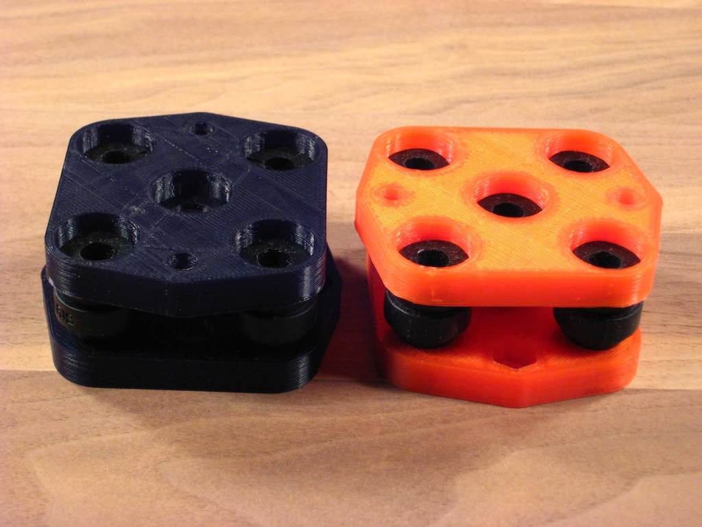 In với các lỗ đai ốc lục giác HƯỚNG XUỐNG, có hỗ trợ. Tôi thích in PLA với 5 lớp trên & dưới, 2 "tường" dọc, chiều cao 0,2 mm, độền 25% - 40%. In hai bộ phận cho 1 bộ giảm rung. Có chỗ cho 5 bộ giảm rung cao su, tối thiểu 4 bộ là bắt buộc.