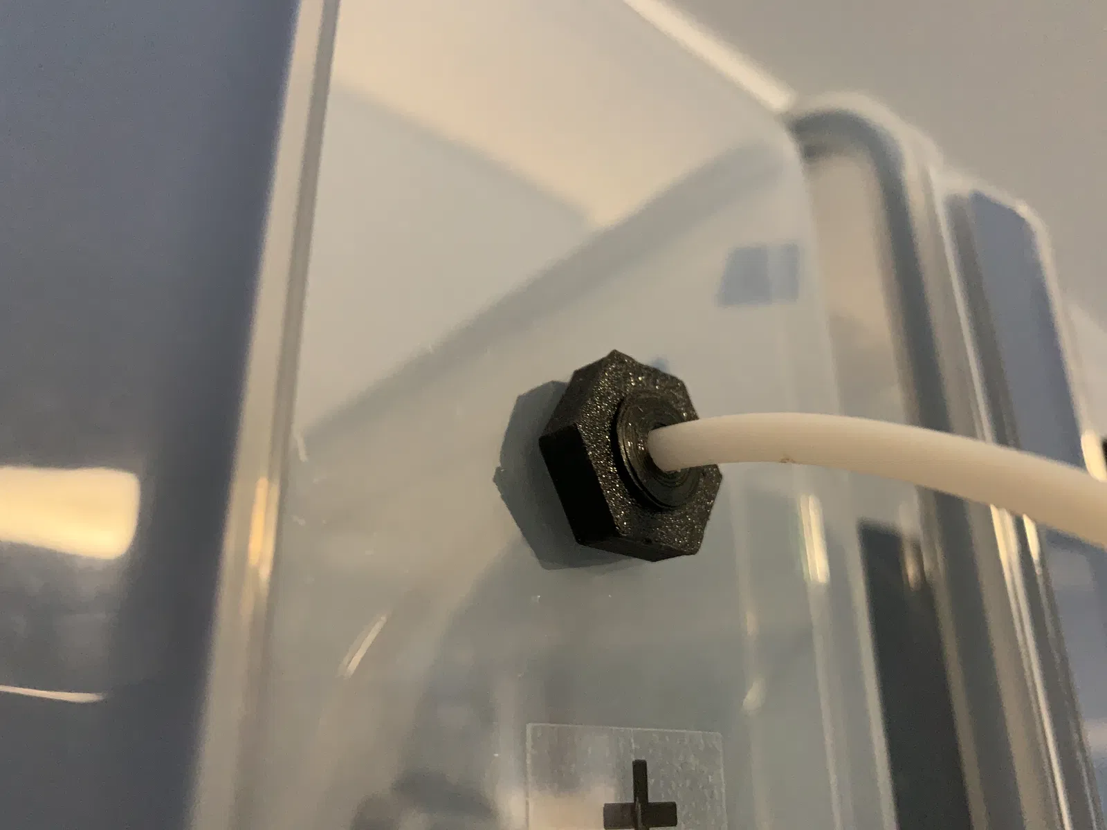 Thiết kế vít M12 và đai ốc rỗng có lỗ 4mm, lý tưởng để lắp ống PTFE 4mm, cho phép luồn sợi filament 1.75mm. Dù không bằng khớp nối khí nén PC4 nhưng vẫn cho kết quả tốt vì không hoạt động dưới áp suất. Có thể cần chỉnh sửa ren và chỉ nên siết bằng tay.