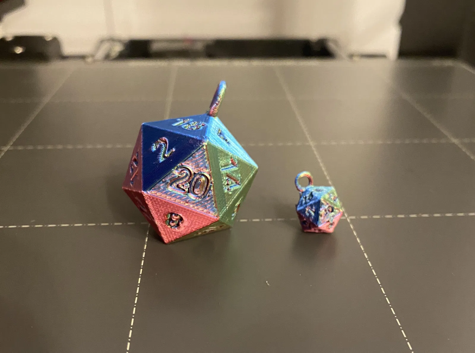 Một mặt dây chuyền hình D20 với phiên bản tí hon để làm bông tai. Sản phẩm này in rất đẹp với độ cao lớp .2, nhưng cần hỗ trợ cho các vòng tròn và brim cho bông tai vì đế nhỏ.