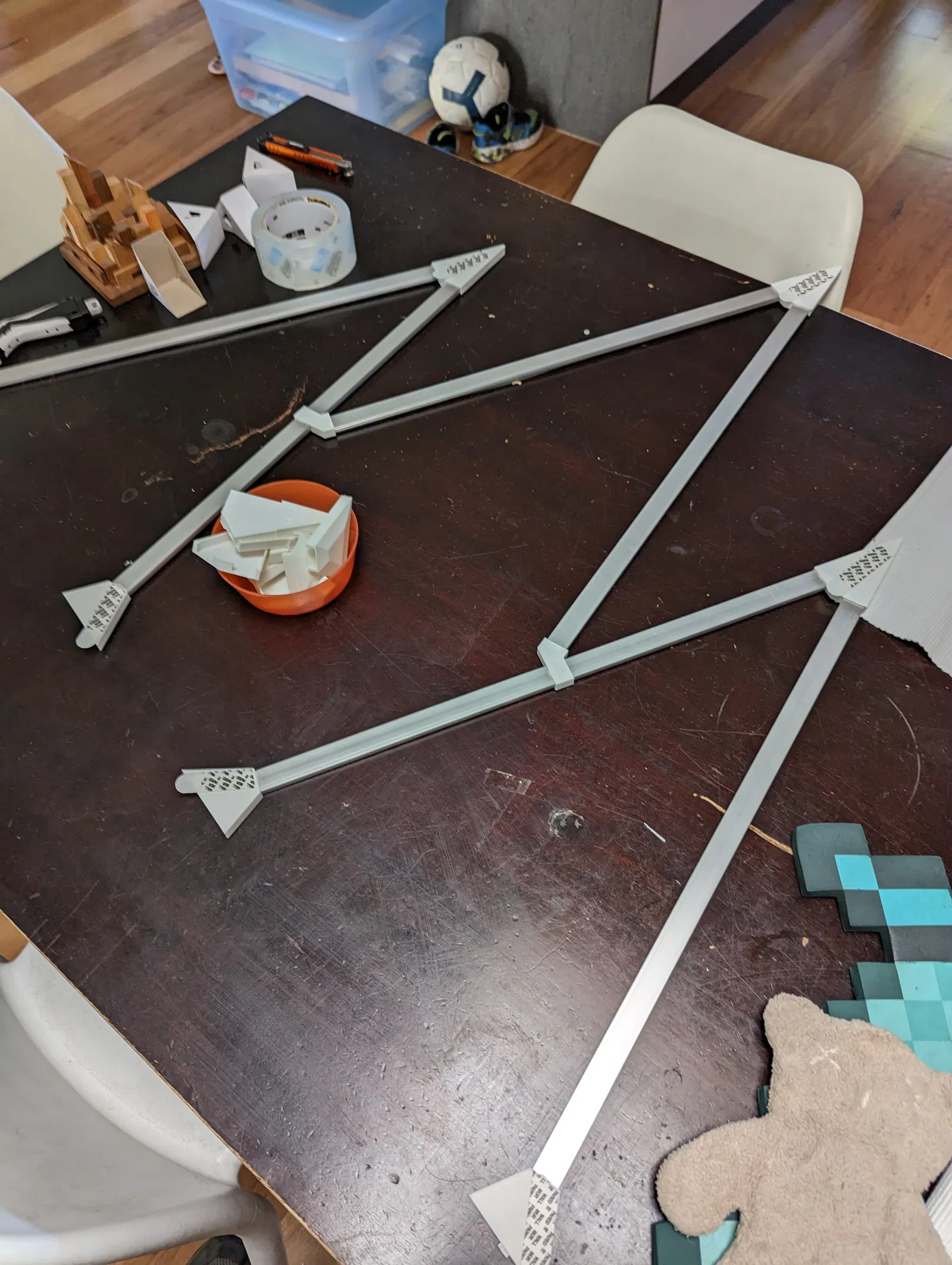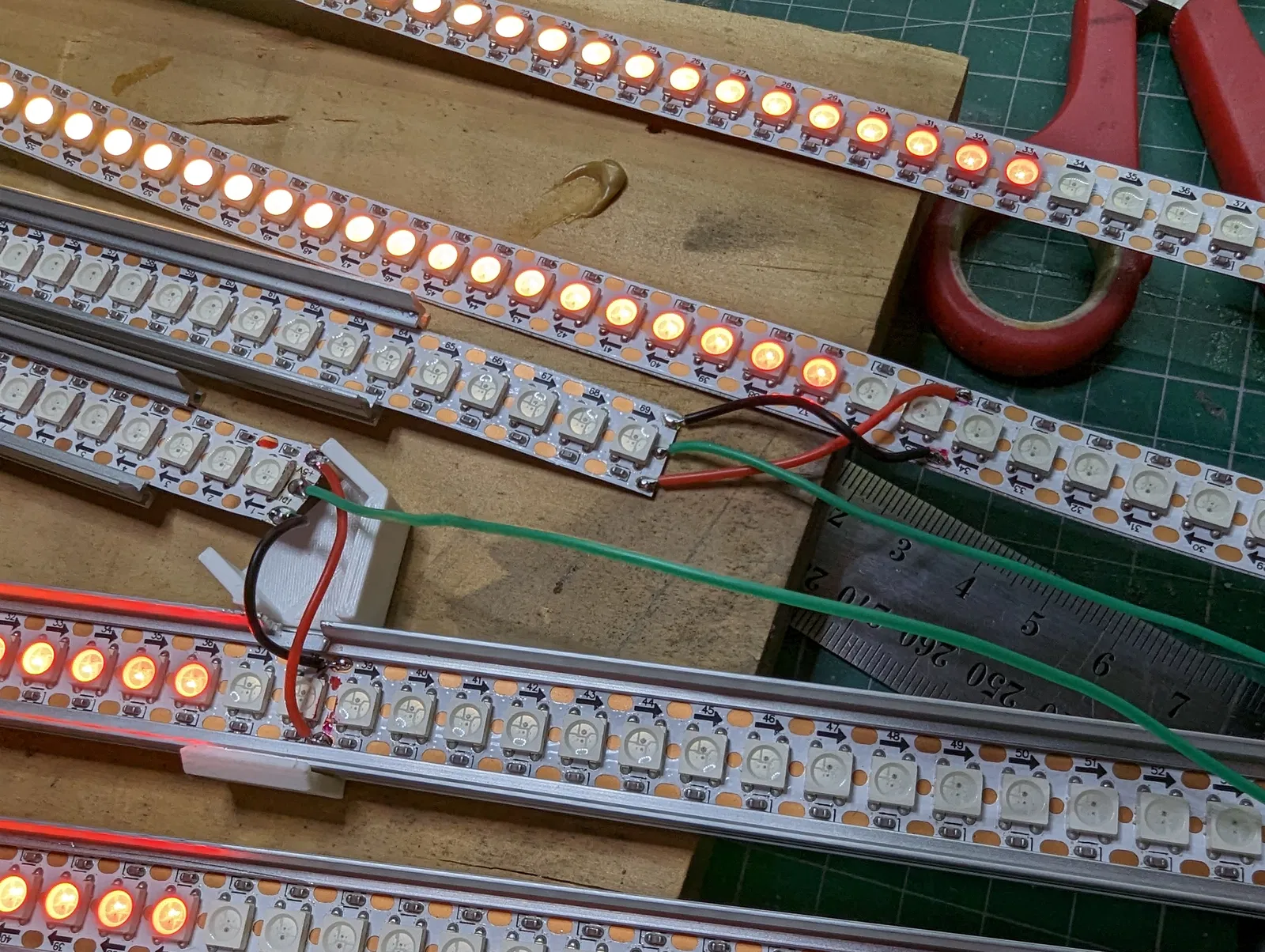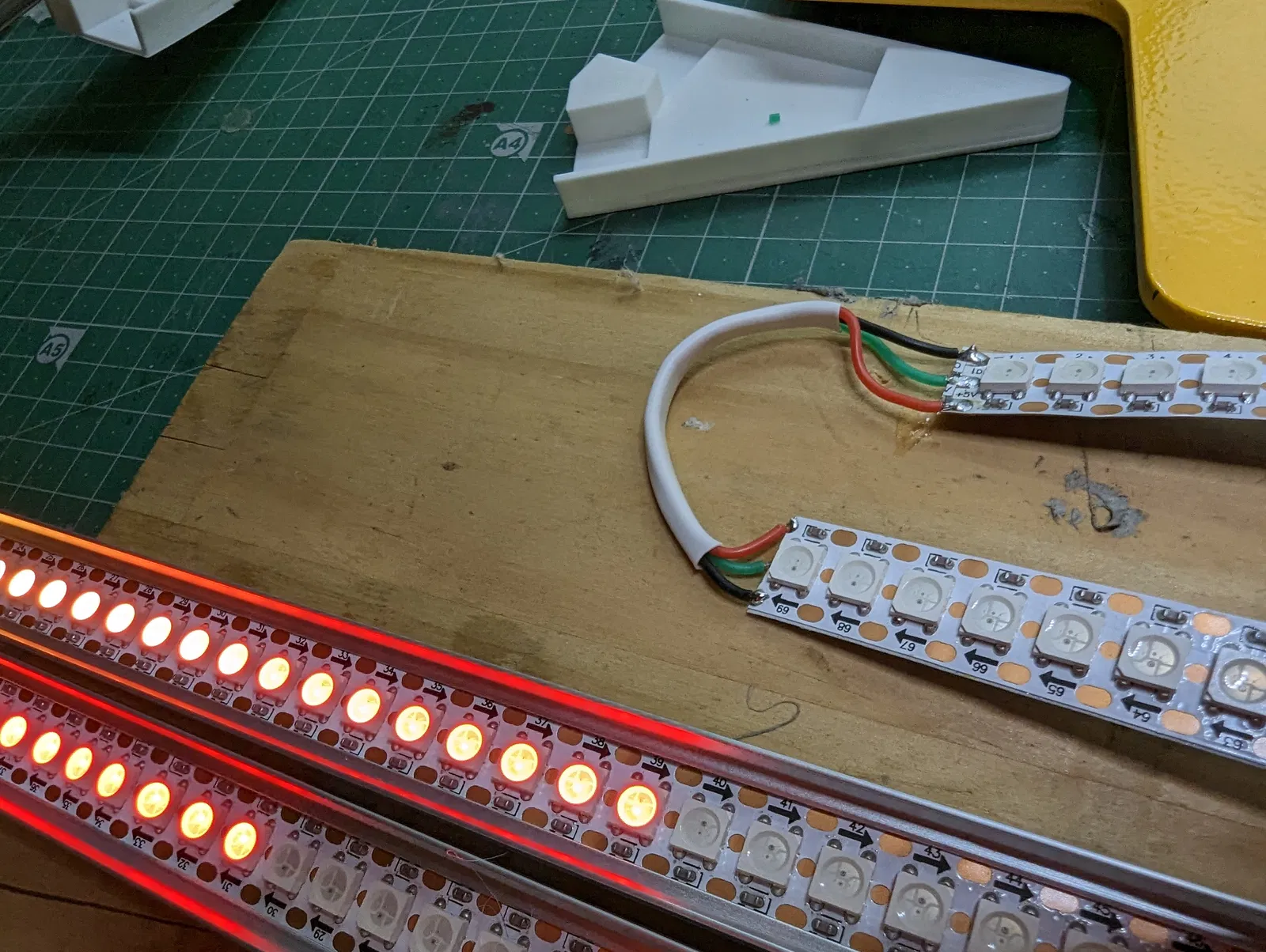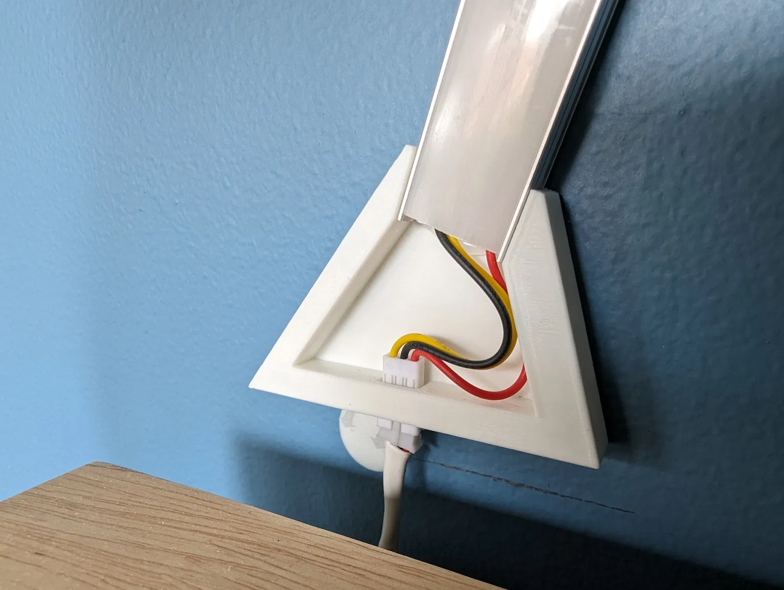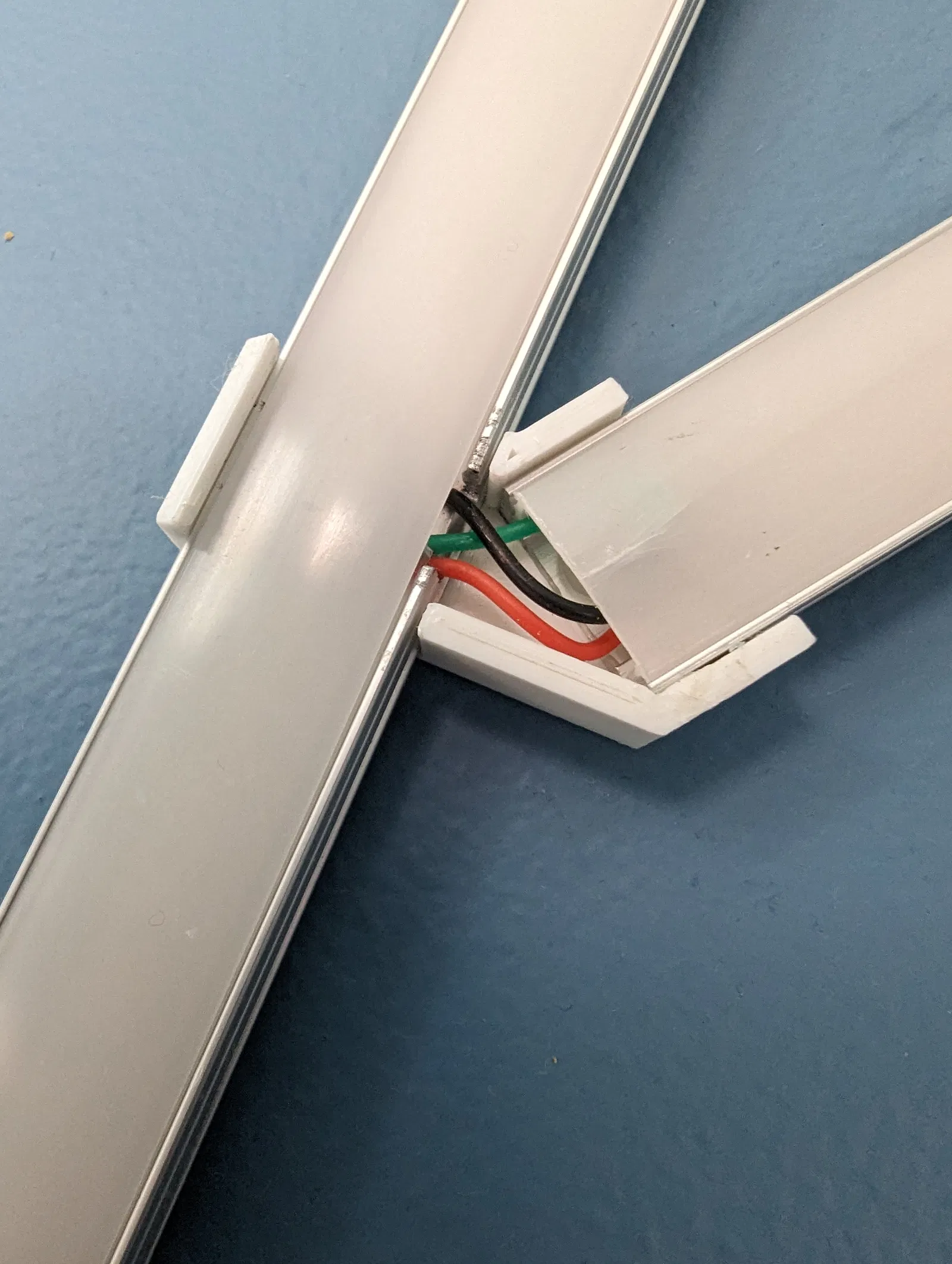 Tui làm cái này cho phòng thằng nhỏ nhà tui. Kết hợp mấy cái thanh nhôm, đèn LED RGB dạng địa chỉ, với mấy cái đầu nối in 3D tự chế để giữ mấy cái thanh đó. Nó chạy bằng firmware WLED và mấy bồ sẽ cần mua (huhu!) hoặc tự làm (yeah!) một cái bộ điều khiển. Tui có để kèm schematic với danh sách vật tư của tui ở dưới nè. Tui làm cái này thành một khối luôn, nên hơi khó gắn lên tường hoặc sửa nếu lỡ có con LED nào ở khúc chót cùng bị tèo (à, vụ này xảy ra đúng một tuần sau khi gắn lên tường luôn).