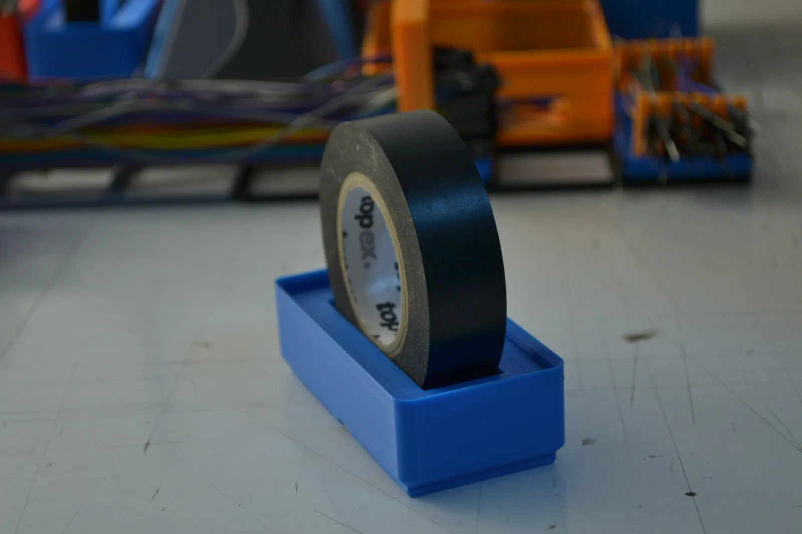 Một bin Gridfinity 2x1 dùng để đựng cuộn Băng keo điện 19mm. Thiết kế có sẵn lỗ gắn nam châm, giúp bạn dễ dàng cất giữ và lấy băng keo khi cần. Phù hợp với hệ thống Gridfinity của Zach Freedman.