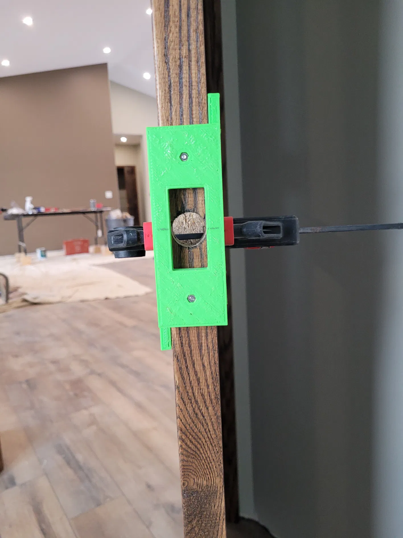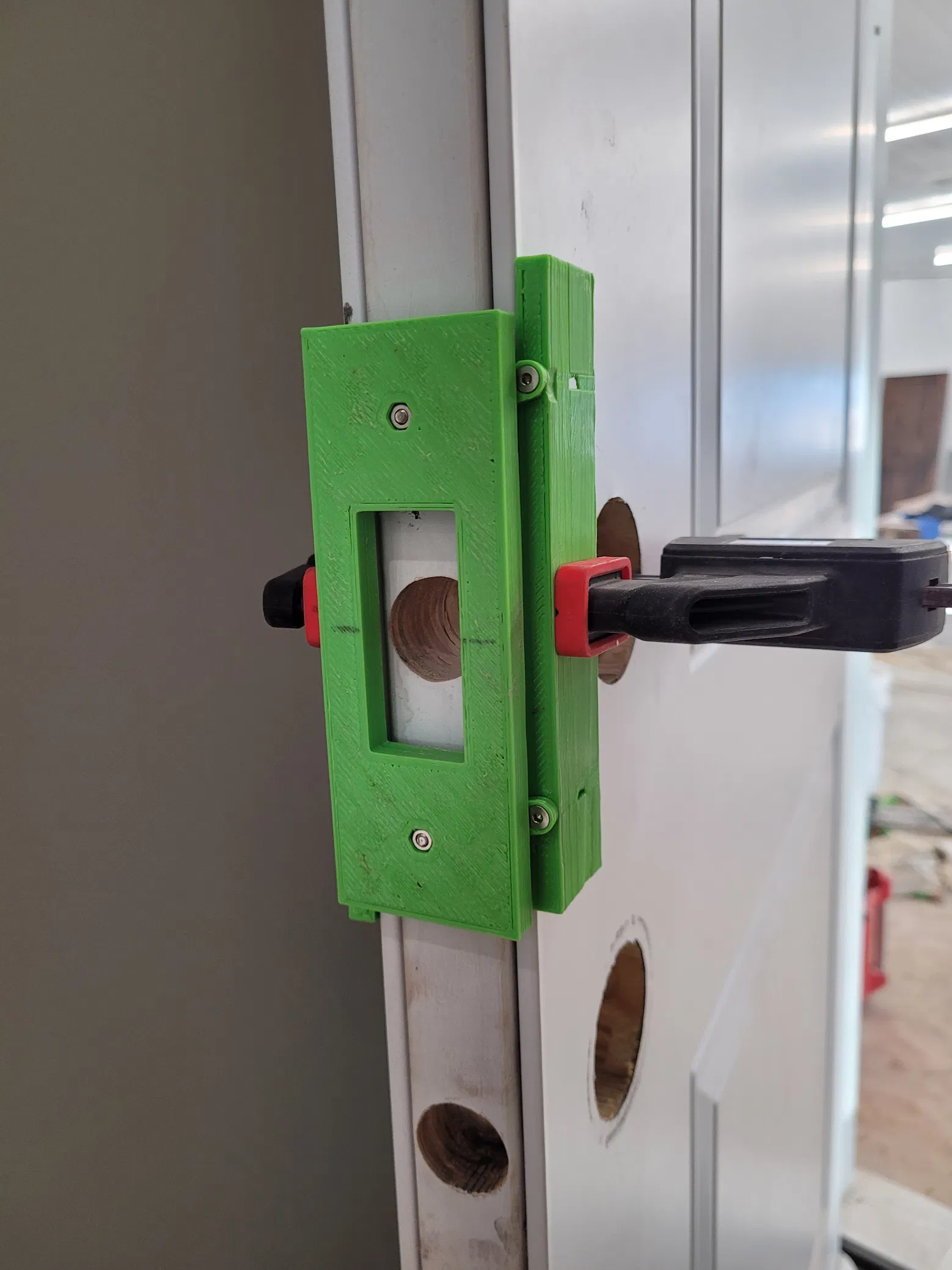 Bộ Jig này giúp bạn khoét lỗ tấm chốt cửa một cách chuẩn xác. Chỉ cần đặt lên lỗ chốt, kẹp chặt và dùng máy phay để có được những tấm chốt cửa được khoét lỗ hoàn hảo!