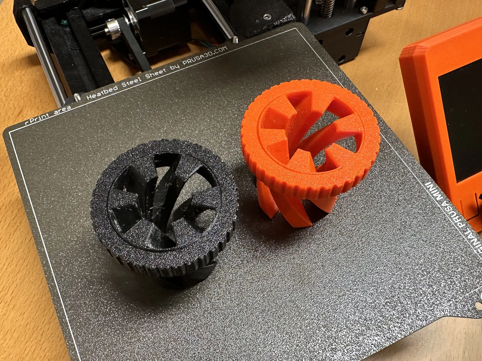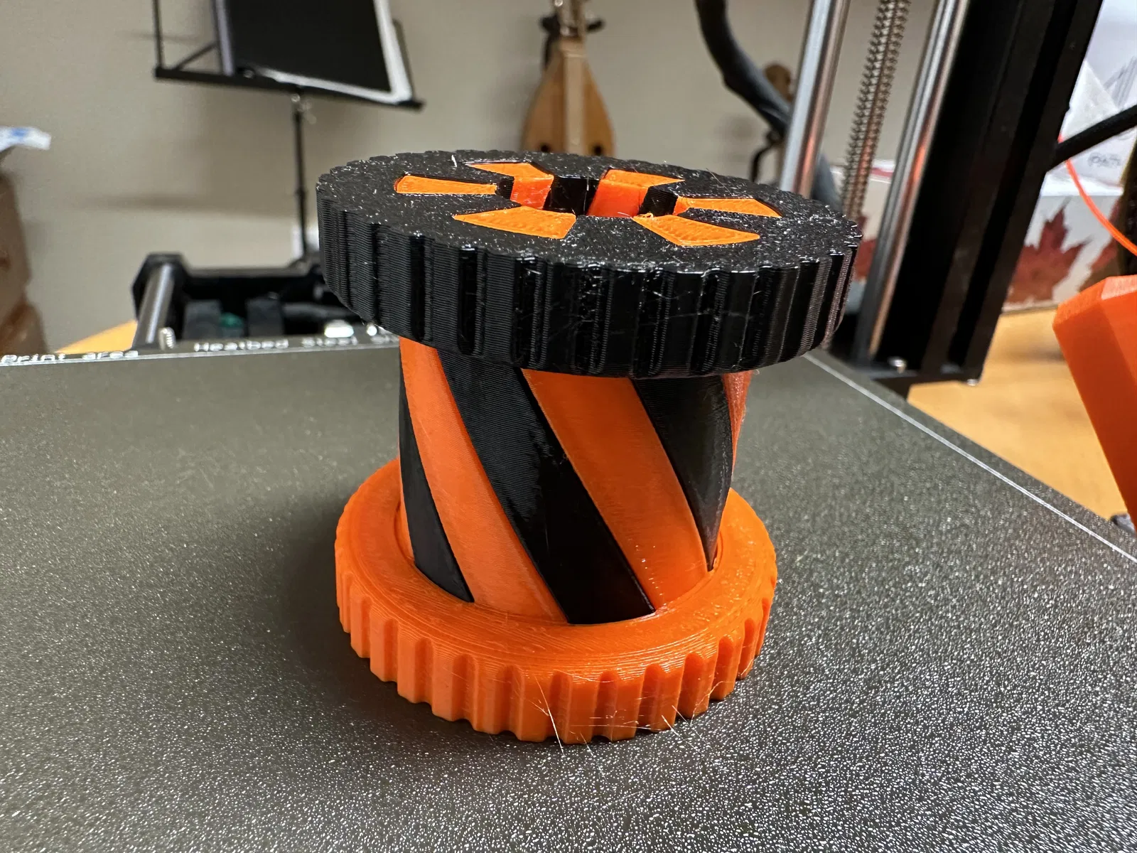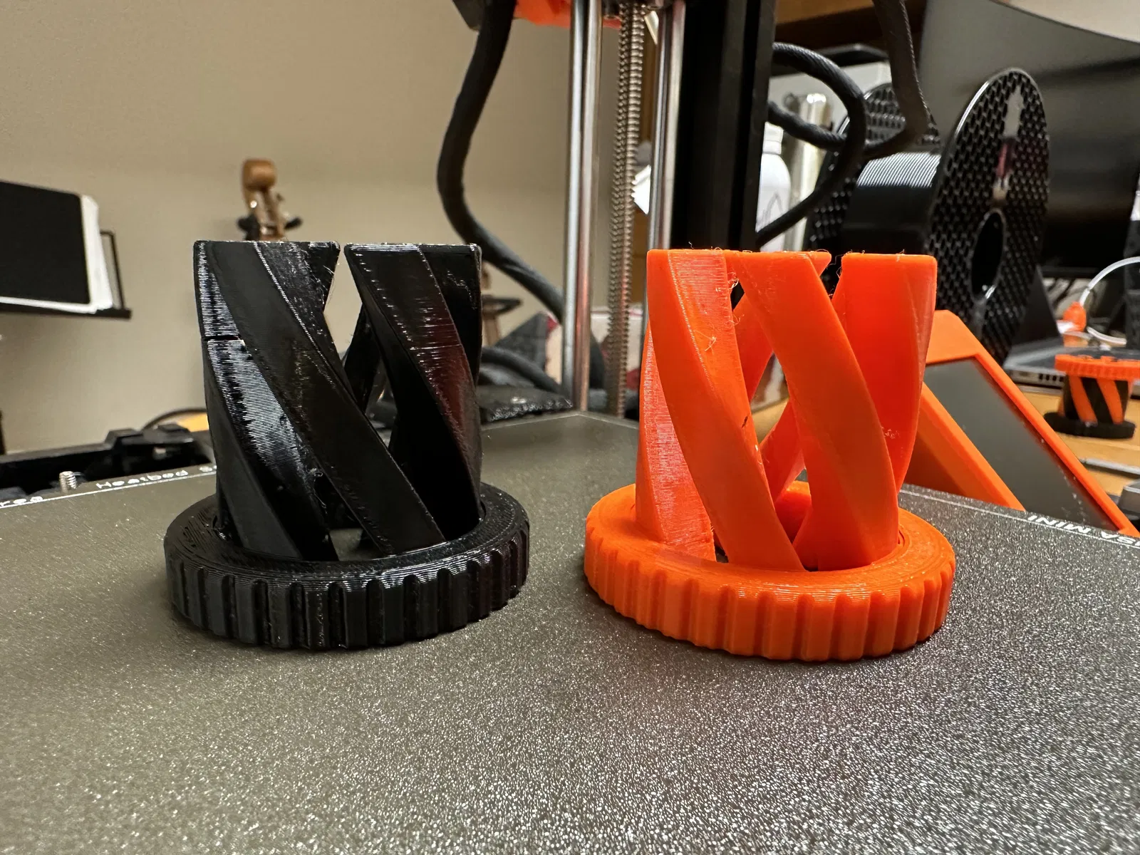 Bản in trong ảnh của tui được in trên máy Mini+ của tui, sử dụng màu cam và đen của Prusament PETG. Mỗi bản in mất khoảng 1h 35 phút ở tốc độ 0.20mm với tính năng Input Shaper mới được bật.
