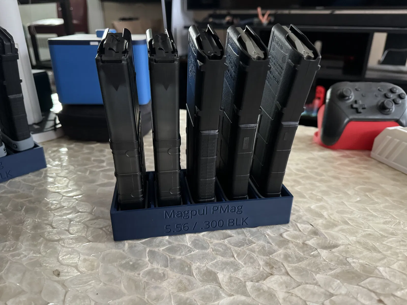 Cái kệ đựng 5 băng đạn PMAG này xài ngon cho cả 5.56 và .300BLK, bao gồm băng đạn 10, 20, 30 viên cả đời 2 lẫn đời 3. In ra không cần support, Lancer Mags cũng xài được luôn. Infill 20% là ok.