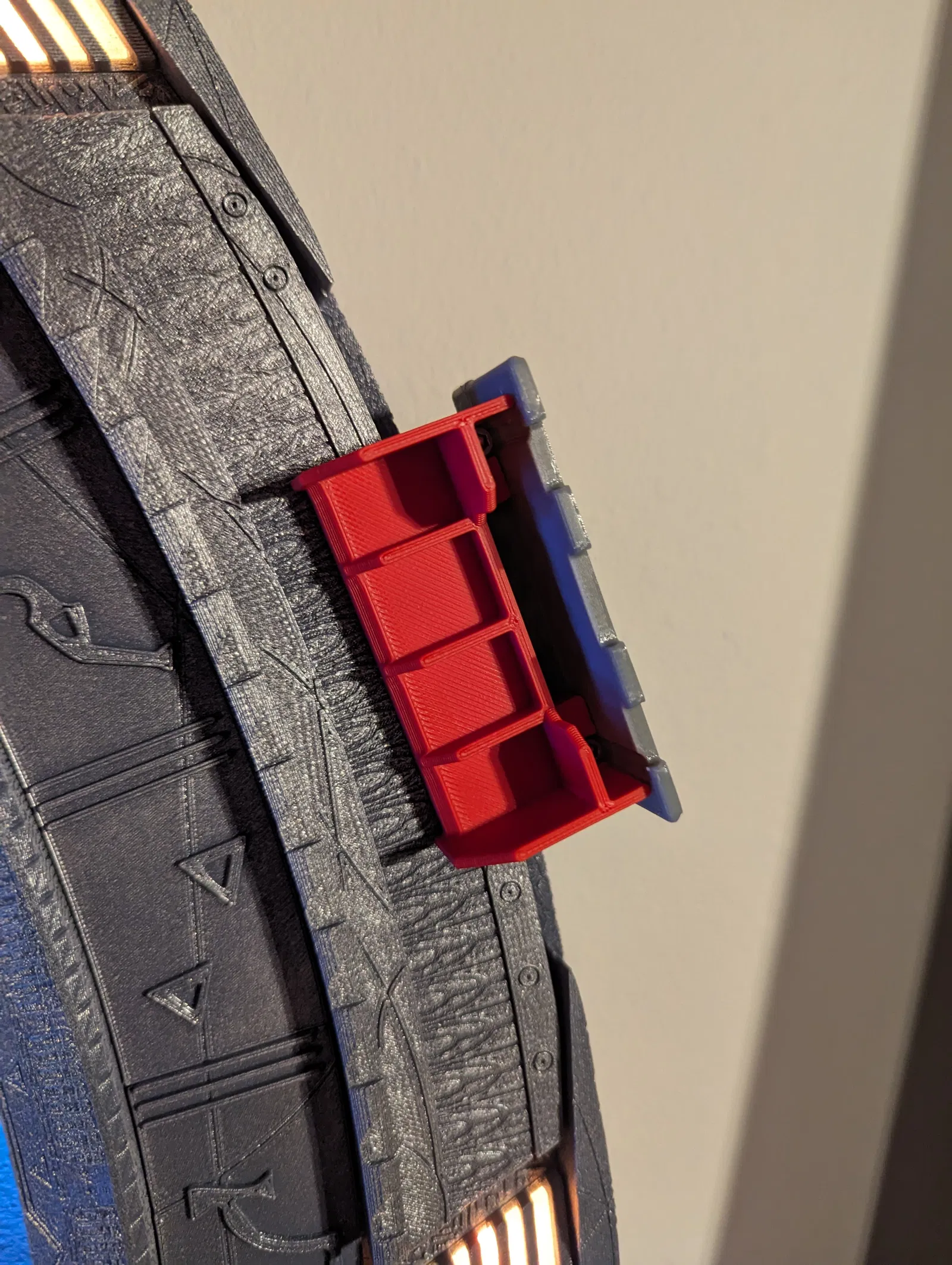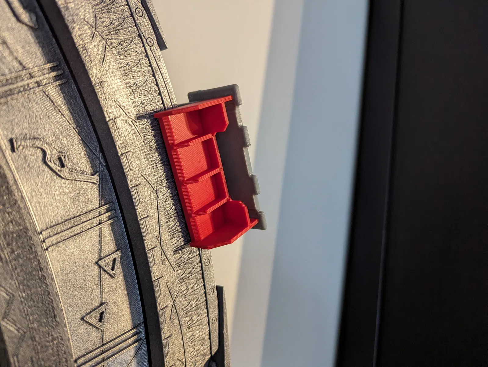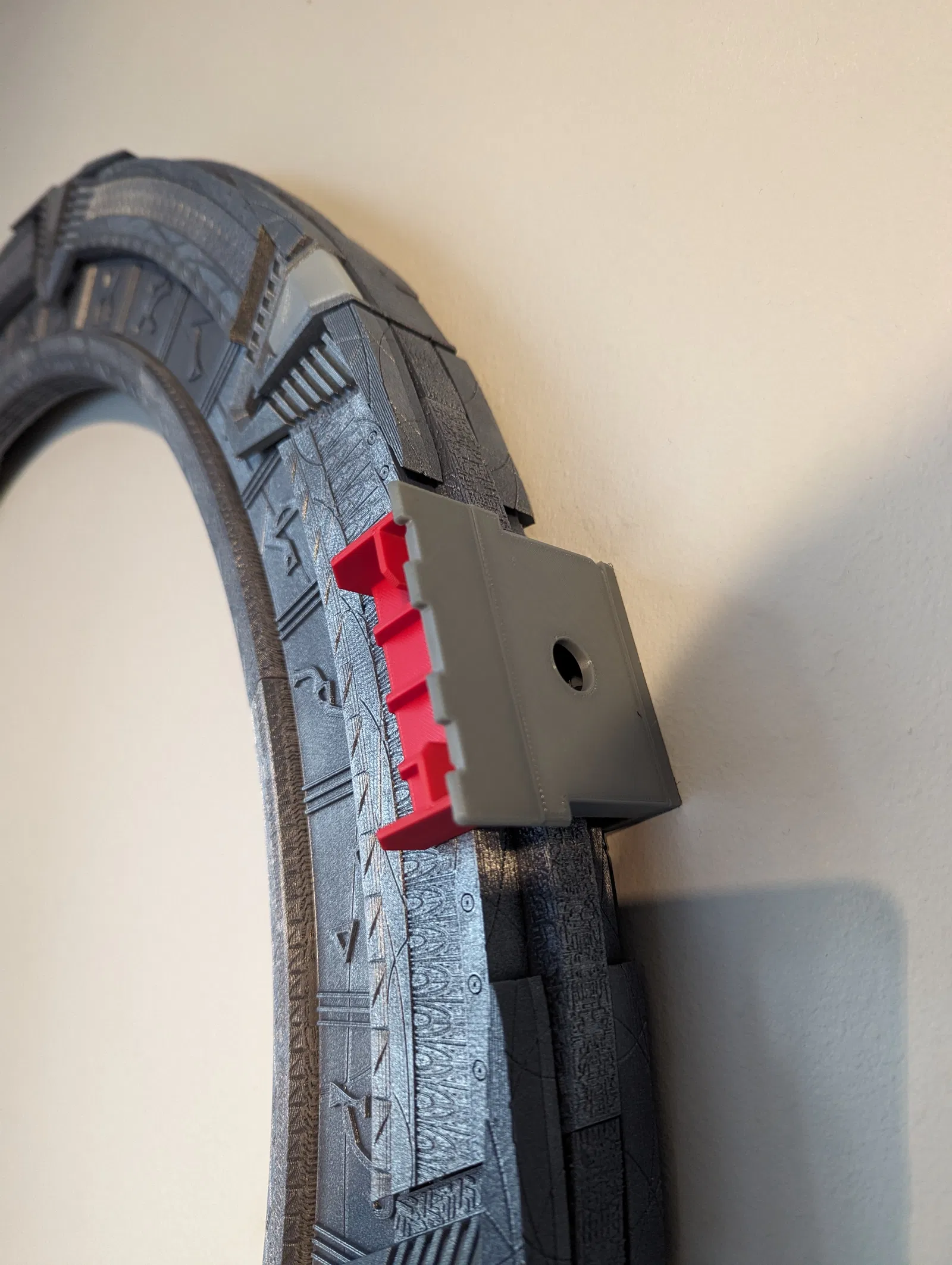 Bộ kẹp treo tường cho mô hình Stargate SG-1 của Martin ở kích thước thật. Dùng 4 kẹp, in bằng PETG cho các bộ phận màu bạc, cần vít M3 16mm. Có thể thêm hỗ trợ cho bộ kết nối tường để tránh bị võng.
