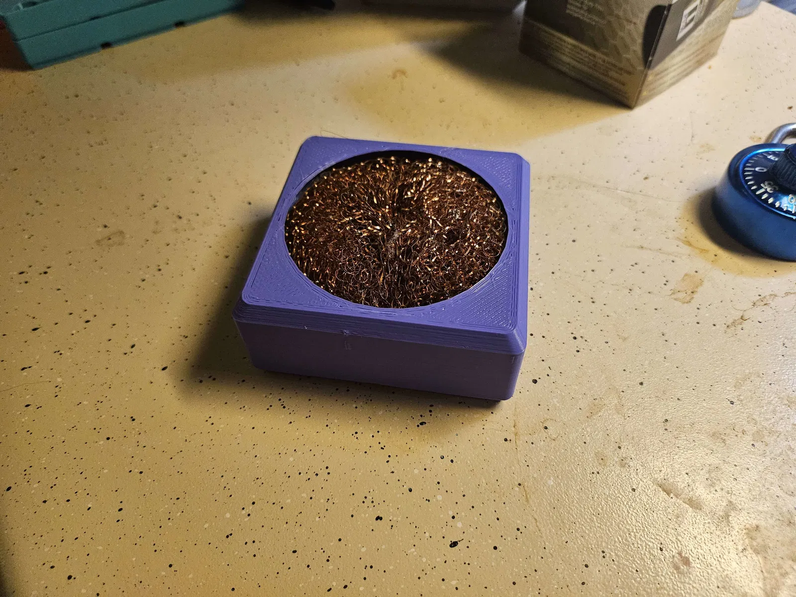 Mô hình nhỏ gọn để đựng miếng cọ rửa bằng đồng. Thiết kế đơn giản, kích thước 2x2 vừa vặn với bộ dụng cụ tùy chỉnh. Yêu cầu thiết kế đơn giản, giữ cọ rửa không bị rơi.