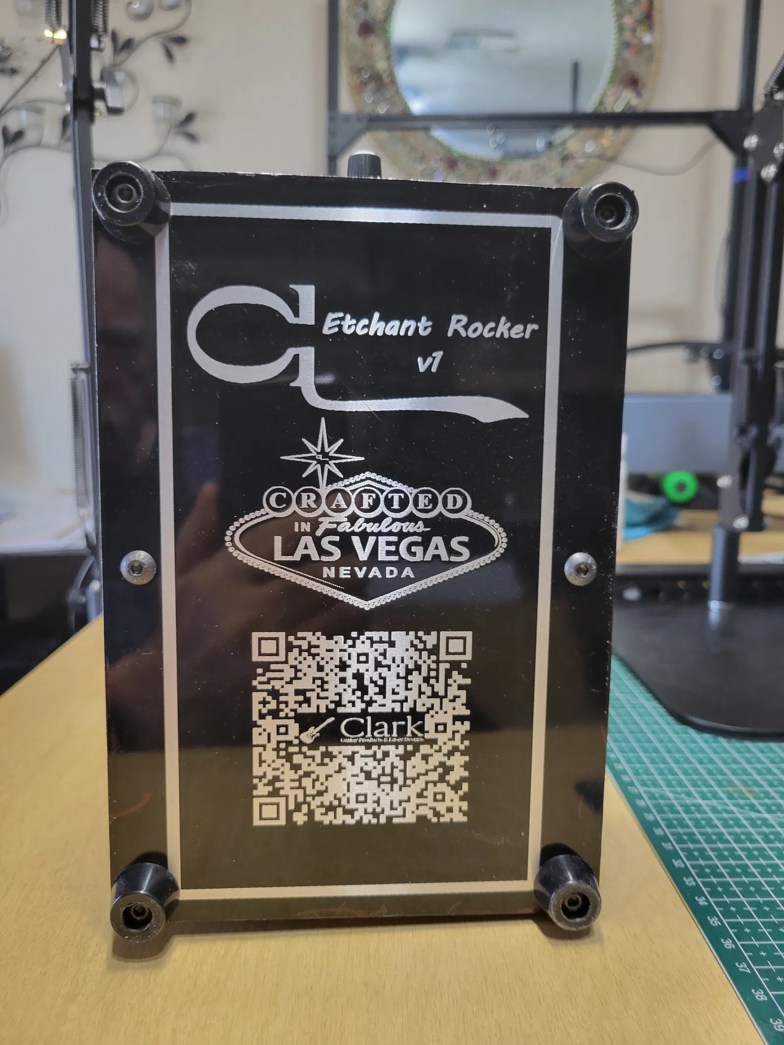 Đây là phần vỏ cho dự án Etchant Rocker, bao gồm mạch PCB, motor, khay và các bộ phận khác. Có bản in từ PLA+ và cả tùy chọn cắt laser bằng gỗ 3mm. Nếu muốn tự làm, cứ hỏi thoải mái nha!