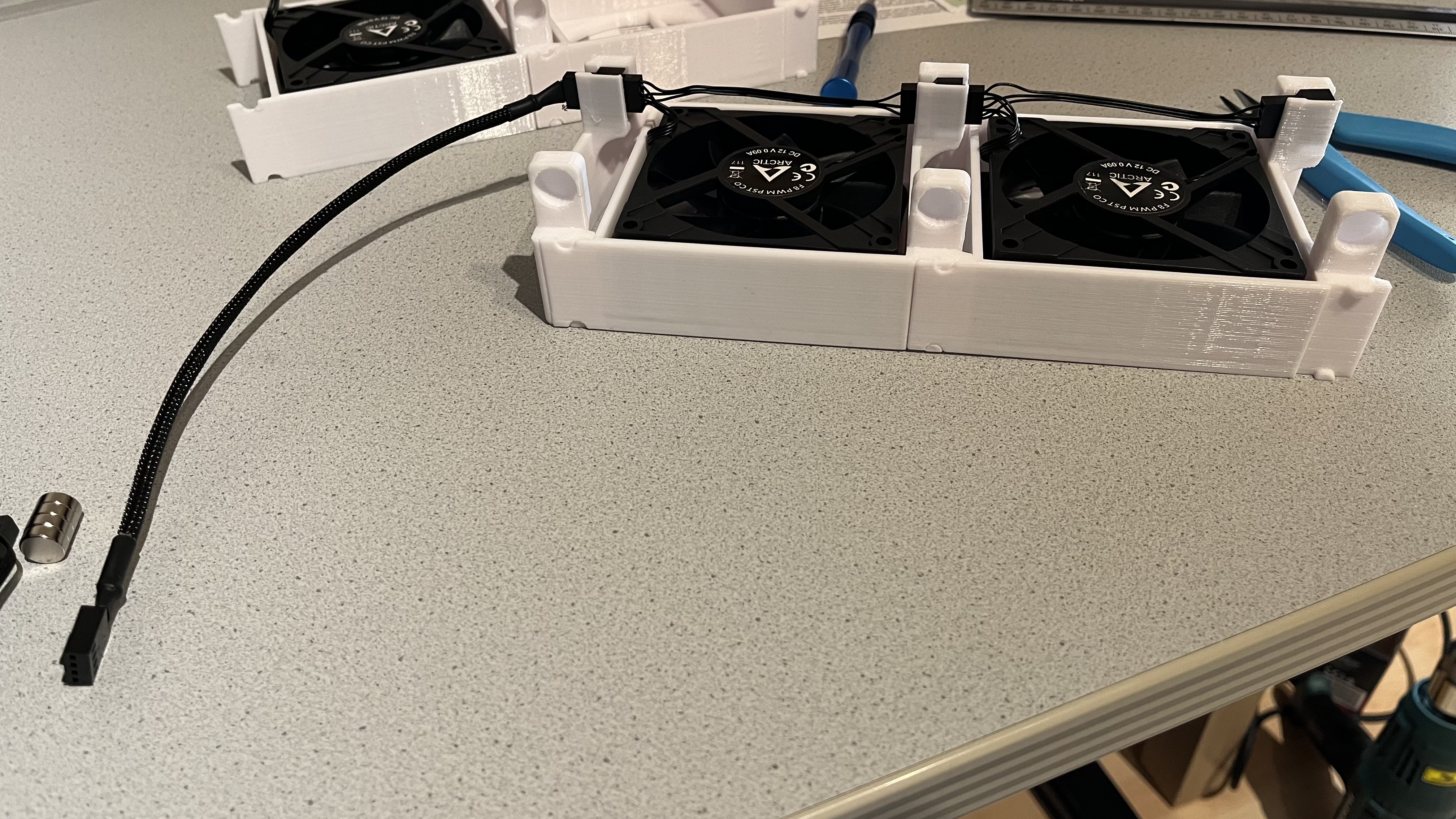 Mình dùng quạt Arctic F8 PWM PST Black - 80 mm (Mã số ACFAN00204A). Loại quạt này có thể điều khiển tốc độ bằng tín hiệu PWM, lưu lượng gió cao khoảng 53 m³/h và độ ồn khá thấp chỉ 0,3 Sone. Ngoài ra, còn có bộ chia Y ngay trên dây cáp kết nối, giúp bạn dễ dàng mở rộng dãy quạt mà không cần nhiều công sức. Thêm nữa, với chu kỳ làm việc từ 1-5%, bạn có thể tắt hẳn quạt. Tuy nhiên, mình không chắc điều này có giống với các loại quạt khác hay không.