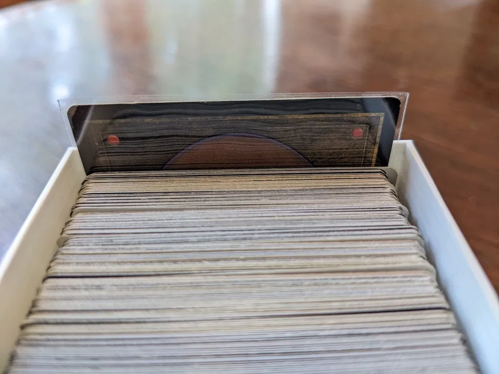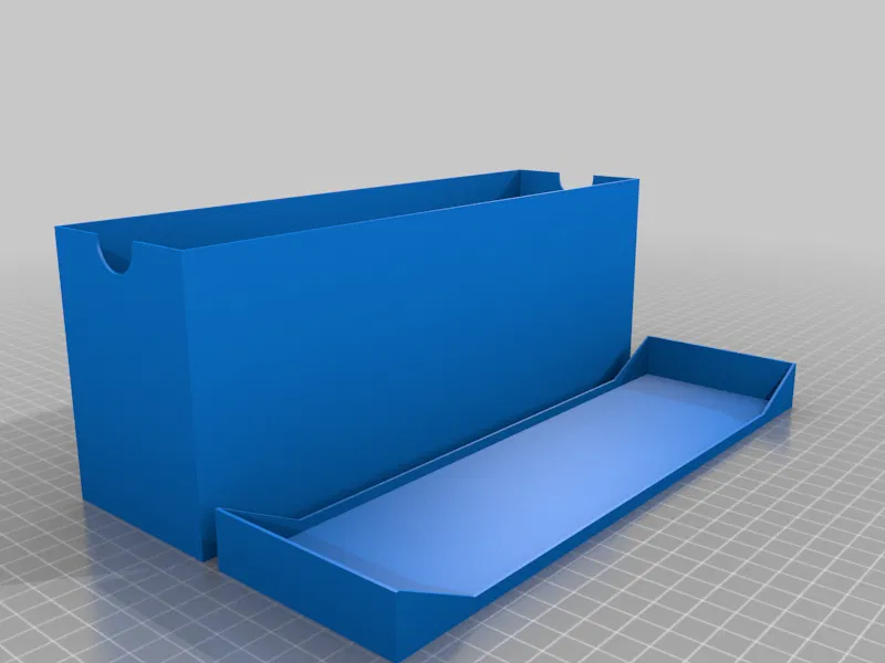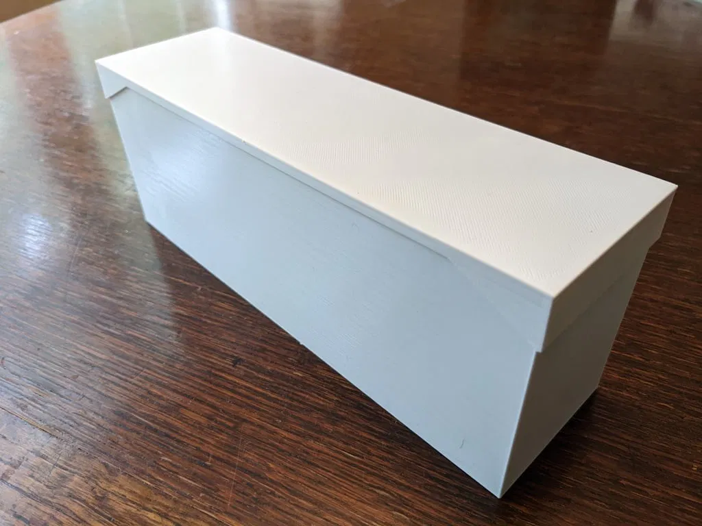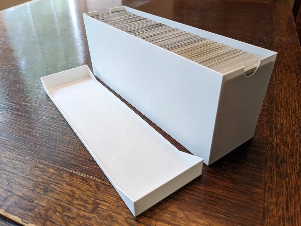 Tôi đã làm cái hộp đựng thẻ bài dạng nắp trượt này để chứa mấy tấm thẻ Magic: the Gathering (TM) mà tôi sưu tầm từ mấy thế kỷ trước. Hộp có thể chứa khoảng 800 lá bài và vừa với cả những lá bài đã được bọc nhẹ. Nắp hộp có khe hở 0.6mm với thân hộp, giúp đóng mở dễ dàng. Các thành hộp dày 1.2mm, vừa cứng cáp lại vừa tiết kiệm vật liệu.