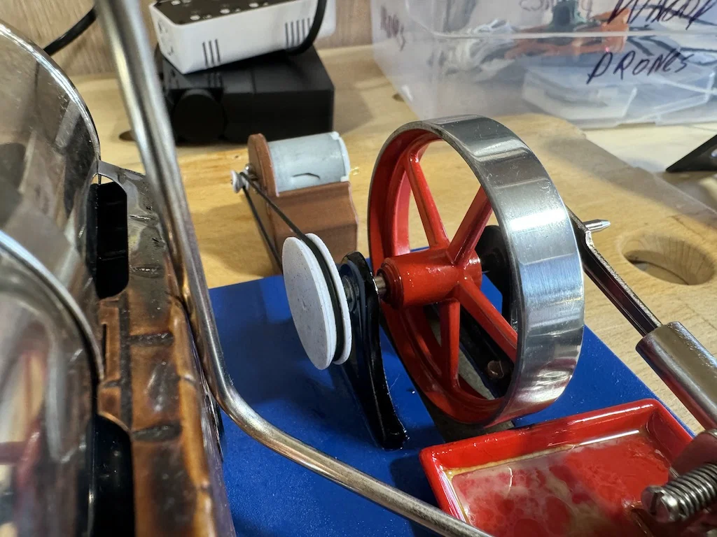 Mô tả máy phát điện dùng cho động cơ hơi nước Wilesco D6. Sử dụng motor DC 12v thông thường để tạo ra điện áp khoảng 4 volt, đủ cấp nguồn cho đèn LED trắng. Các thông số bánh răng có thể tùy chỉnh trong tệp .f3d.
