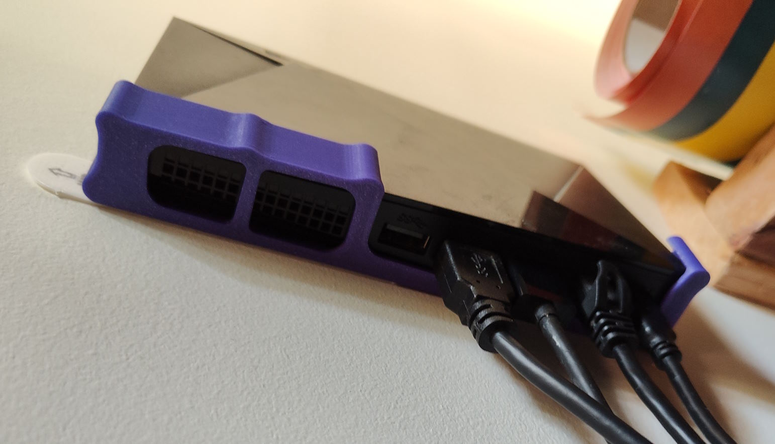 Cái đế này cho phép bạn dễ dàng thao tác với Shield TV của mình vì không có cáp nào bị giữ chặt. Chỉ cần dán 1 hoặc 2 miếng dán Command Strips vào mặt sau, ấn mạnh và đợi (làm theo hướng dẫn). Giờ thì bạn có thể dễ dàng đặt Shield TV vào đế.