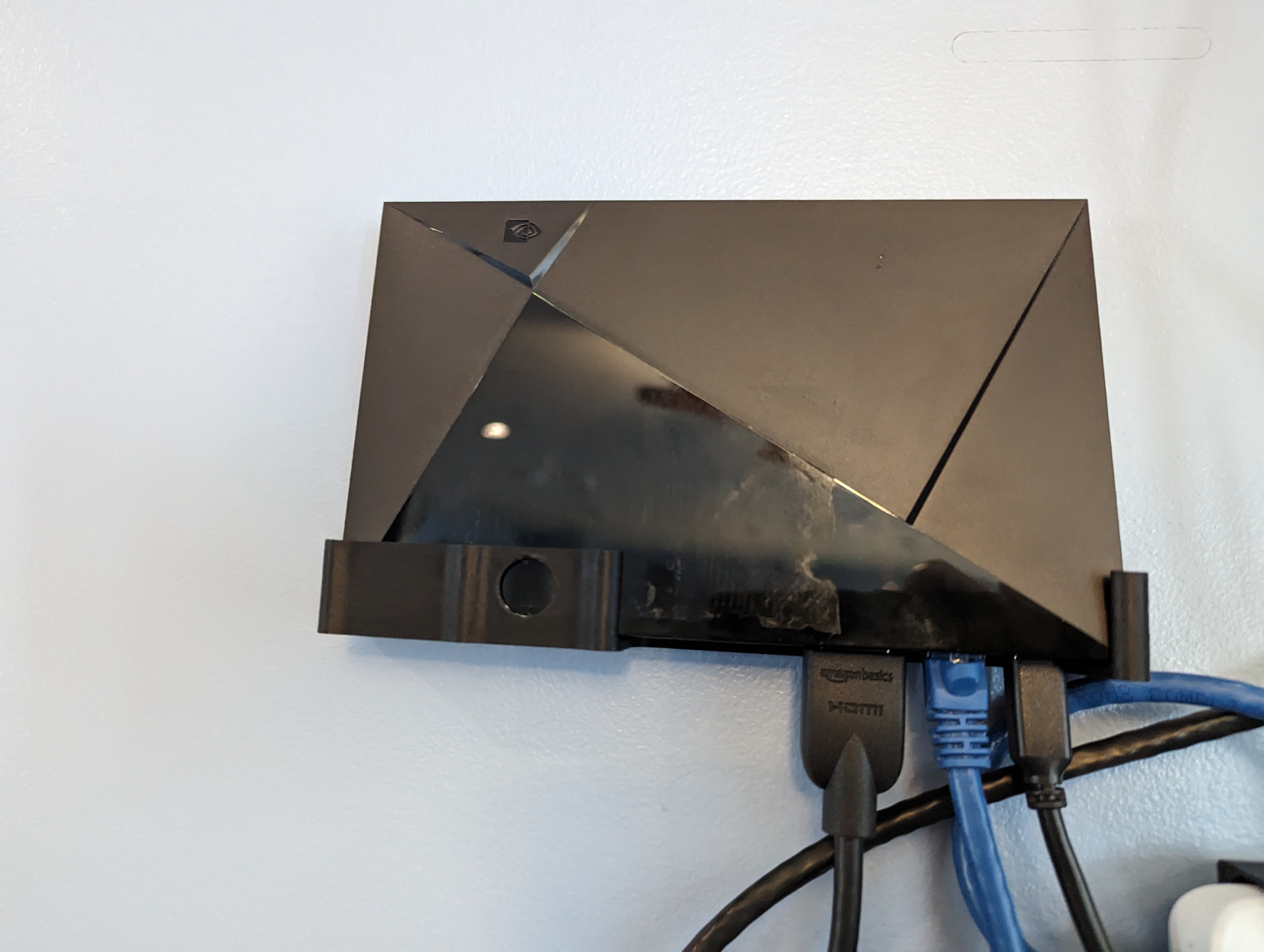 Mẫu đế treo tường tùy chỉnh cho NVIDIA Shield TV Pro, sử dụng ốc vít M4 thay vì băng dính 3M. Có thêm lỗ luồn tua vít và phần đế được làm dày hơn. Thích hợp cho người dùng muốn giải pháp gắn tường chắc chắn hơn cho thiết bị của mình.