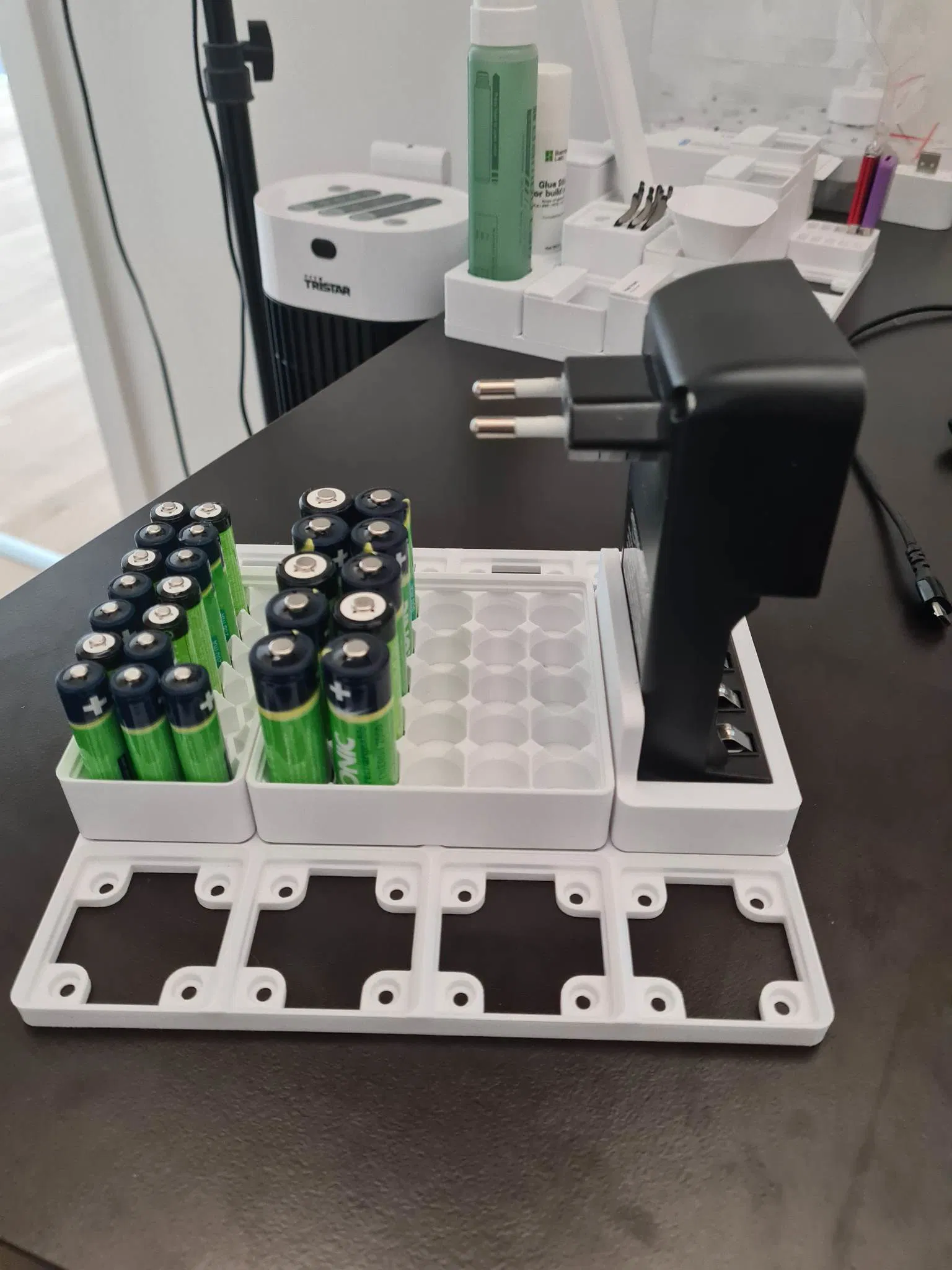 Nếu bạn thích Gridfinity và đang dùng mấy cái đế pin AAA với AA đơn giản, thì có lẽ bạn cần chỗ để sạc pin.