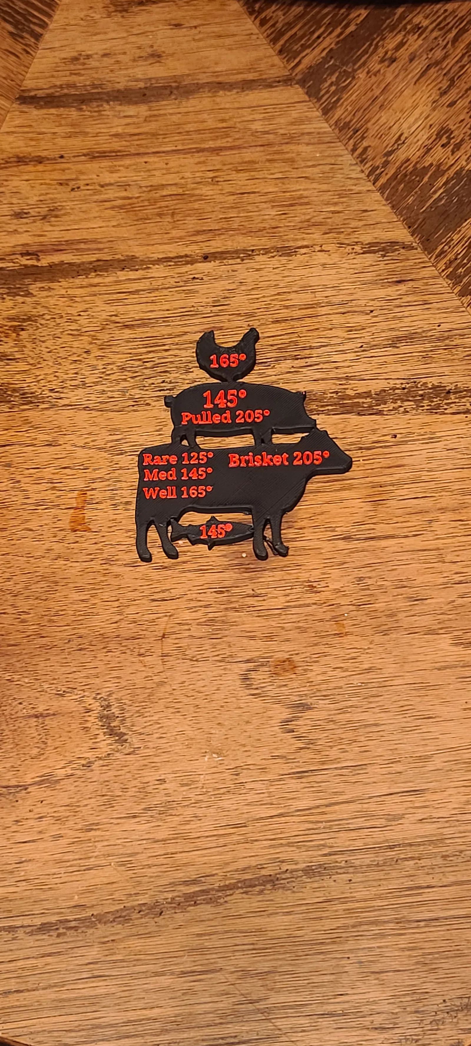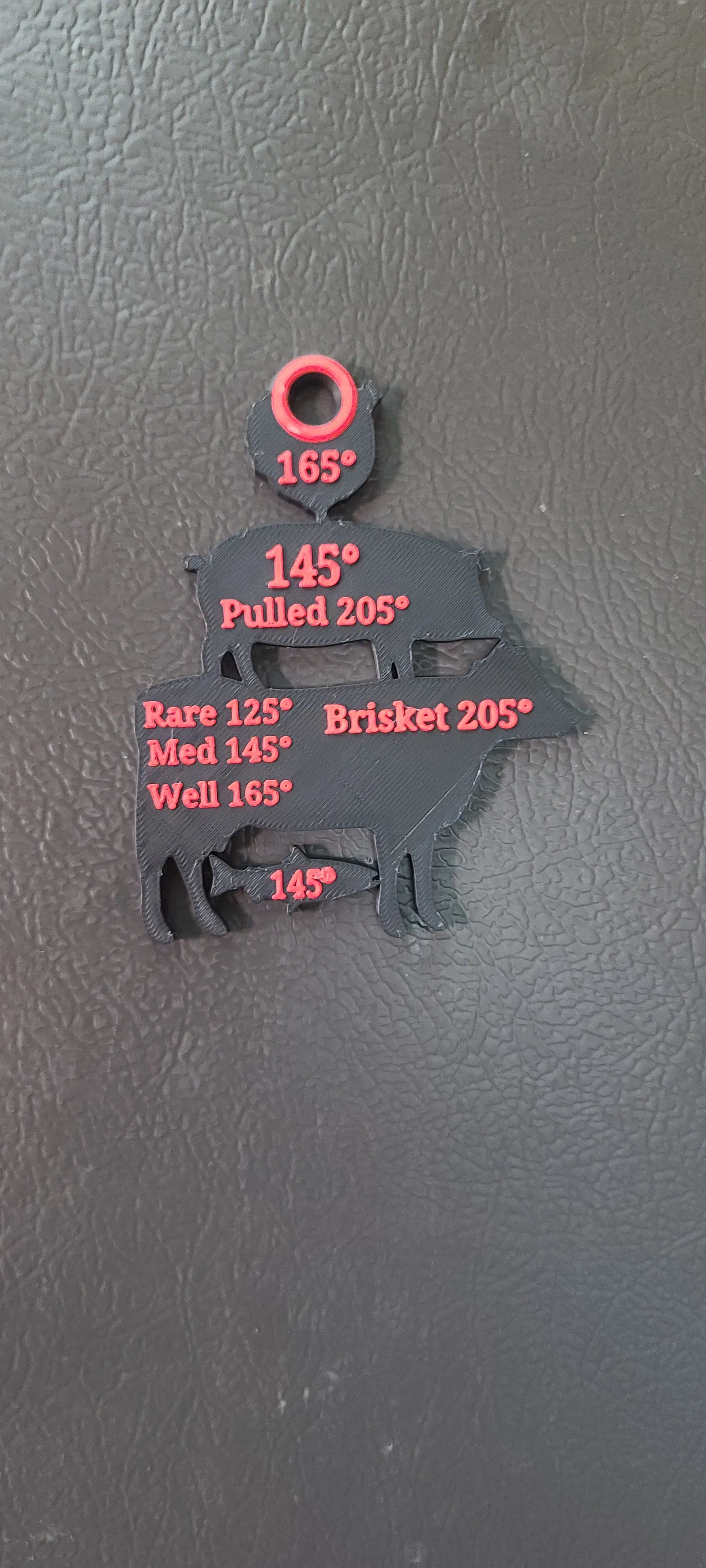 Hướng dẫn nhiệt độ thịt, có sẵn bằng cả Fahrenheit và Celsius. Bạn có thể chọn phiên bản có lỗ nam châm, vòng treo hoặc cả hai. Hướng dẫn này cũng có thể được tùy chỉnh màu sắc với AMS. Nam châm đi kèm có kích thước 8x3mm, và các lỗ nam châm được thiết kế khít chặt để không cần keo dán.