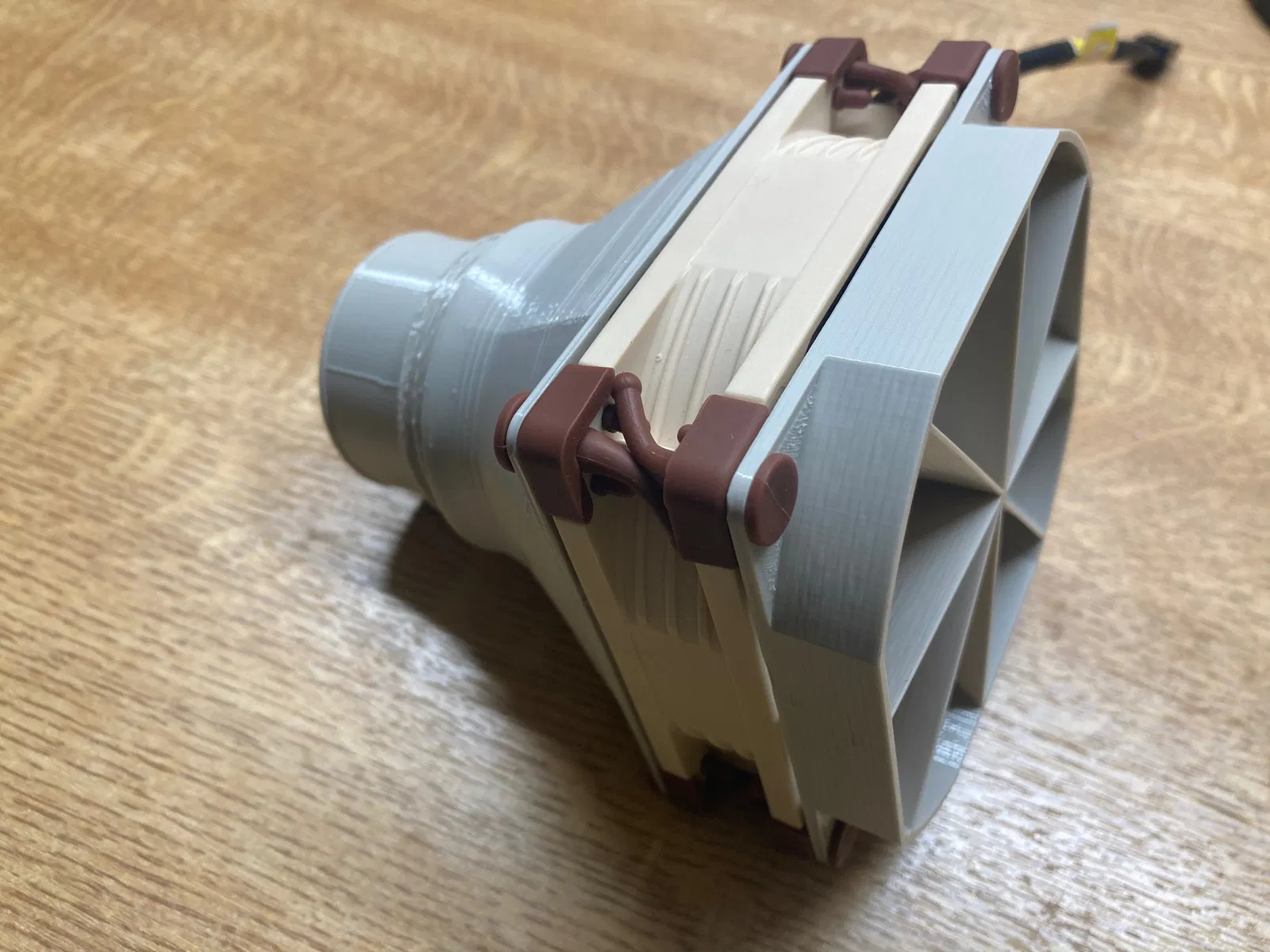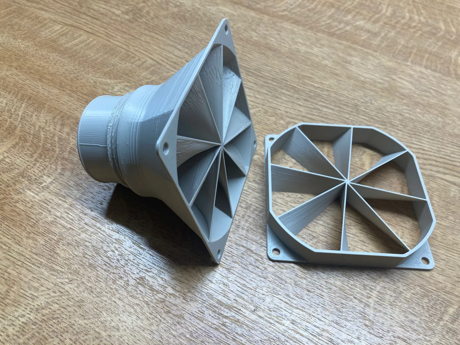 Ống dẫn quạt cho vỏ Ikea-Lack, dùng cho quạt 92mm có bộ tăng áp suất tĩnh (máy nén hướng trục). Giúp hút mùi ra khỏi vỏ bằng ống hút 50mm tùy chọn. Có phiên bản mới với cánh tĩnh và cửa nạp lấy cảm hứng từ động cơ phản lực.