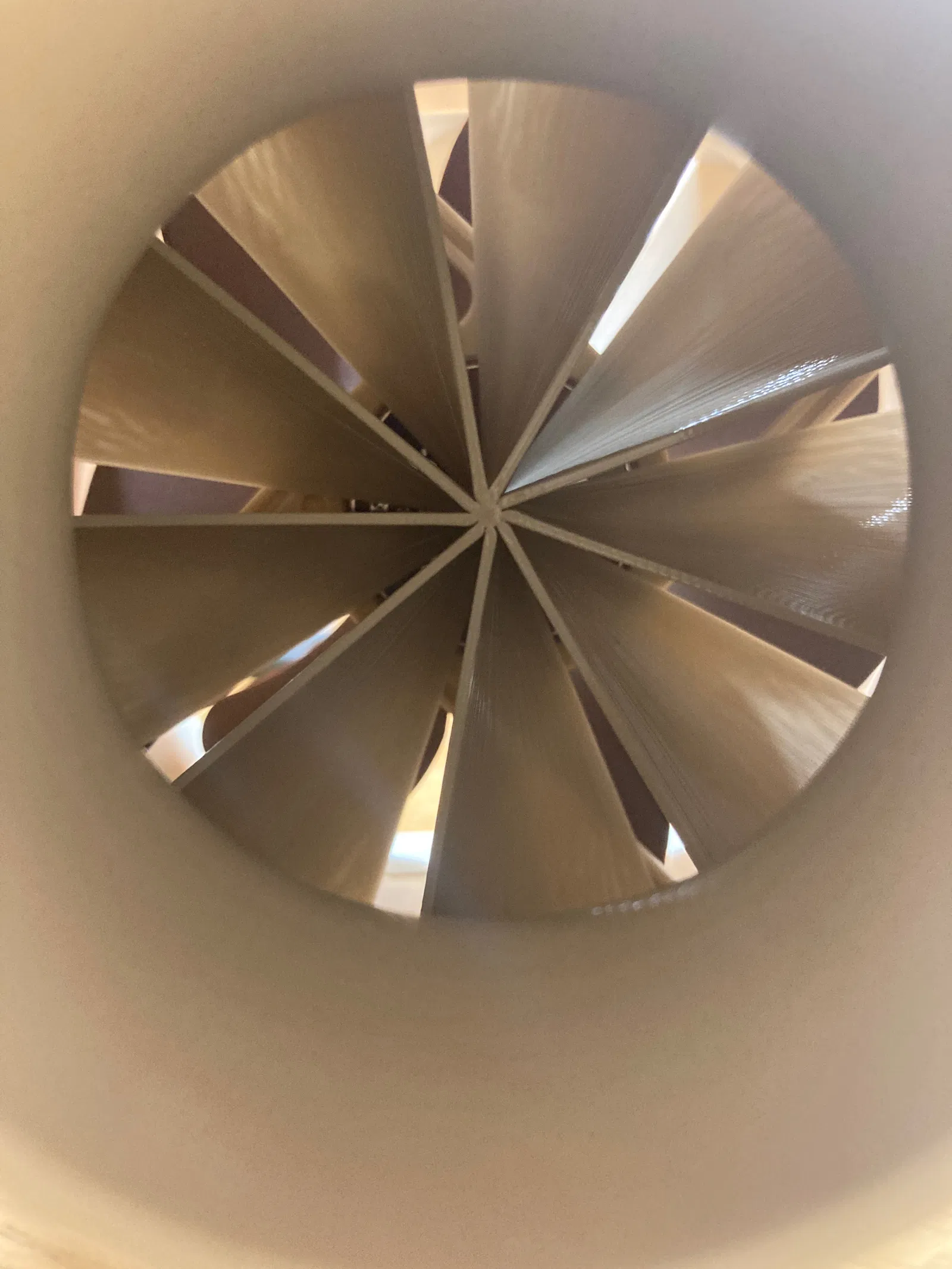 Để tăng áp suất tĩnh của quạt, một phiên bản có cánh tĩnh và cửa nạp có cánh đã được thêm vào. Thiết kế lấy cảm hứng từ máy nén hướng trục trong động cơ phản lực. Đối với phiên bản mới, xem housing-with-stator.stl và inlet.stl