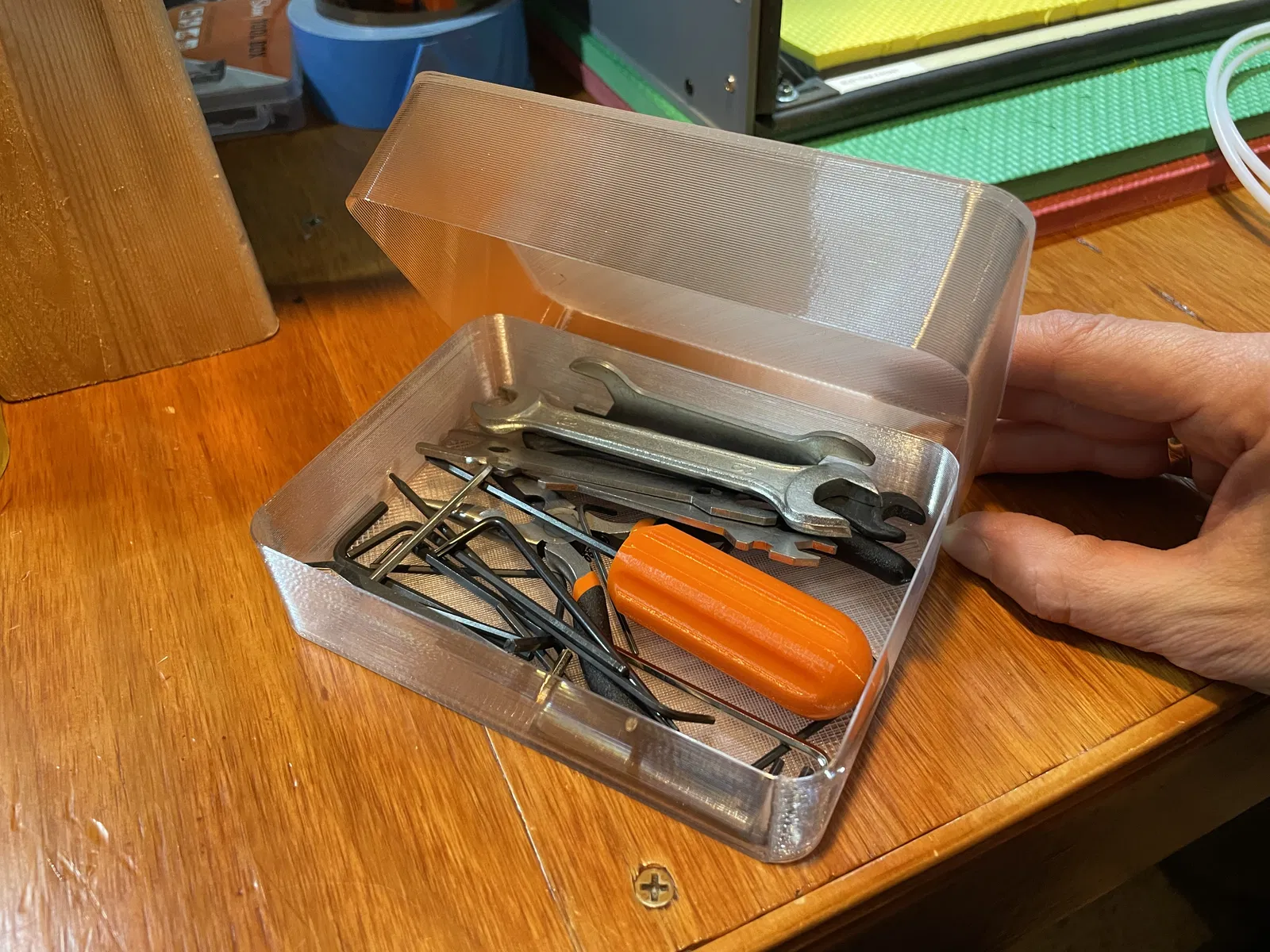 Chán cảnh để đồ nghề bảo trì máy in 3D lung tung, chủ topic thiết kế hộp "mở chậm" này. Tối ưu cho đầu phun 0.8mm để in lẹ. Có file .step cho anh em chỉnh sửa thêm.