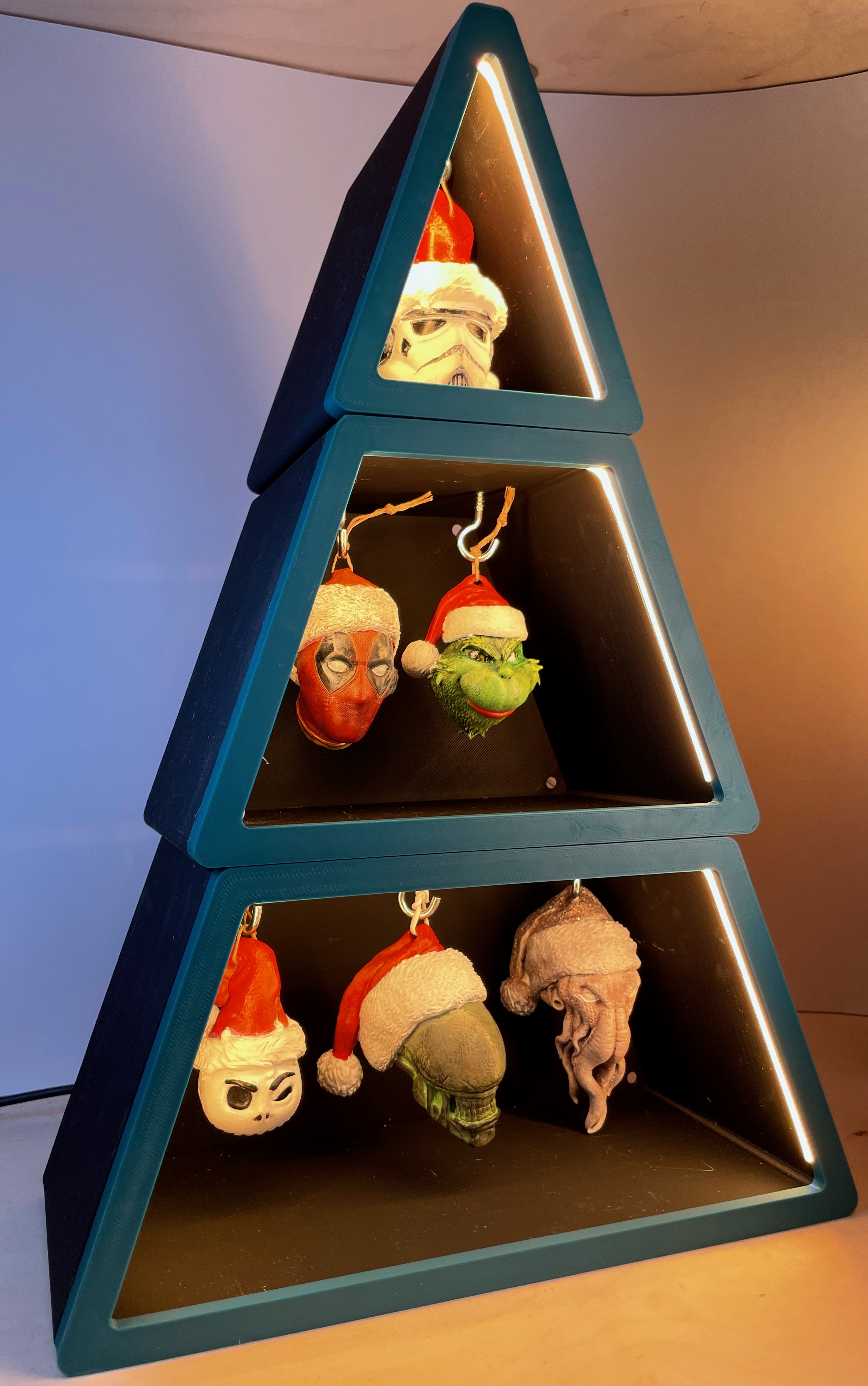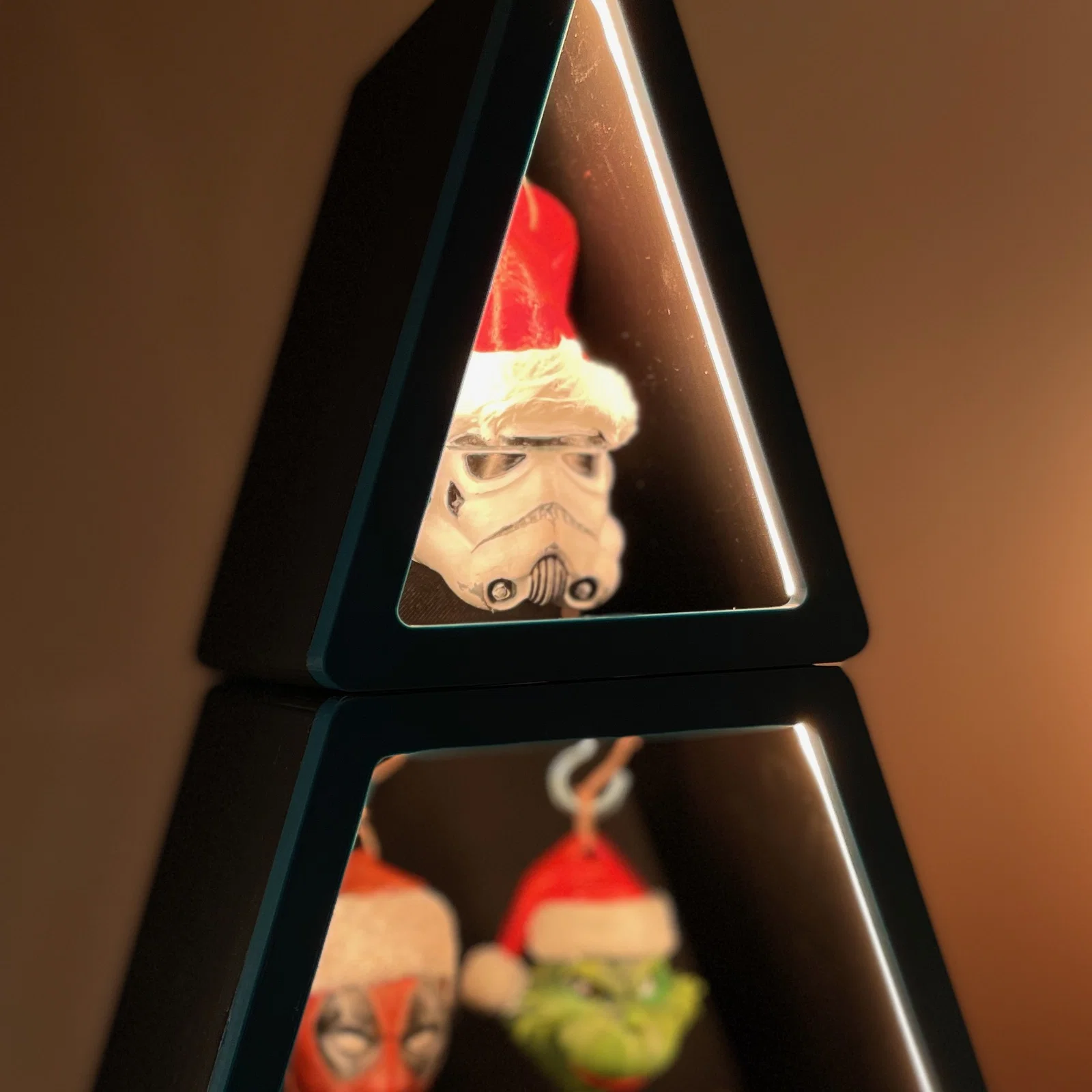 Tạo cây thông Giáng Sinh tối giản để trưng bày đồ trang trí Giáng Sinh yêu thích của bạn và mang lại không khí lễ hội. Cây được chia thành 6 phần để dễ in với ít filament màu xanh lá và dễ gắn đèn LED, có lỗ luồn dây và gờ che đèn.