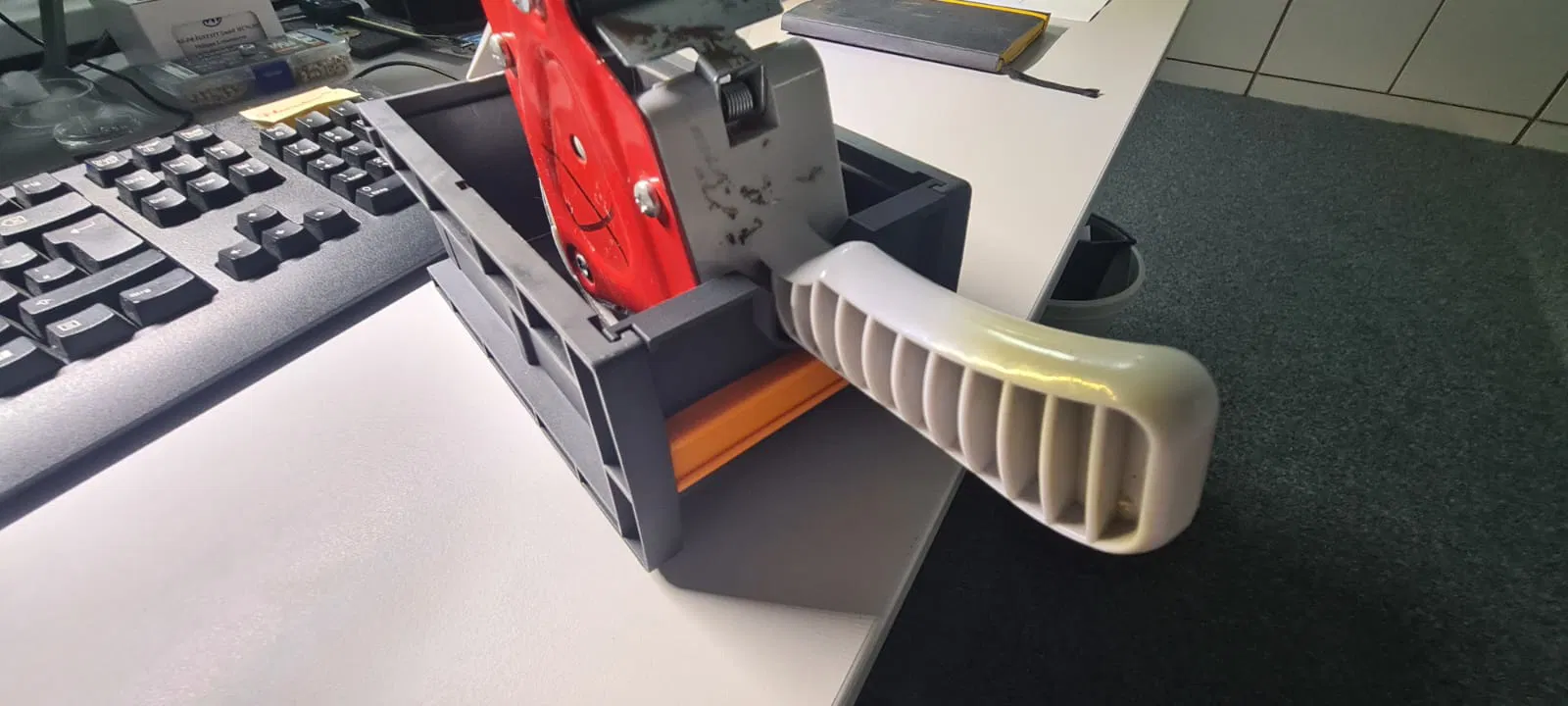 Mặt trước hộp Garant AB1, có nhiều ứng dụng khác nhau. Phiên bản tháng 11.2023 bao gồm loại kín và loại có chỗ gắn con lăn băng keo. File Fusion360 được cung cấp để người dùng có thể tự do chỉnh sửa theo ý muốn.