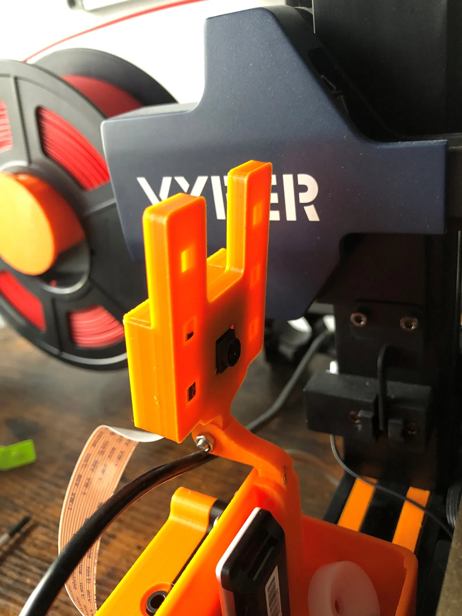 Cái này là một cái đế nối dài cho giá đỡ camera Pi, giúp bạn đưa camera ra xa đầu phun hơn và điều chỉnh góc quay dễ dàng. Phù hợp với máy in Anycubic Vyper, sử dụng nhựa PLA+ màu cam.