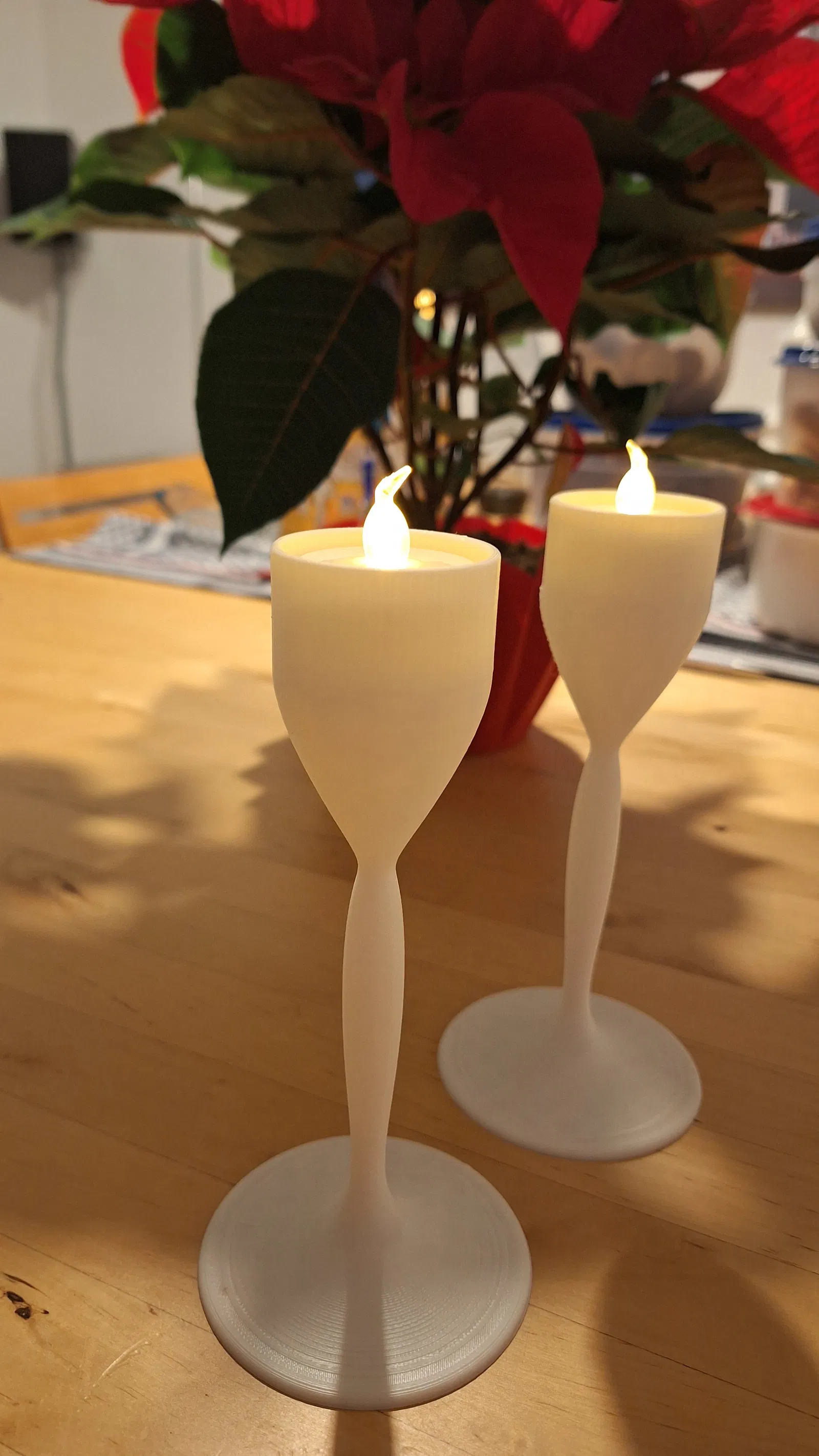Hai cái chân nến thanh lịch, thiết kế tối ưu cho việc in ấn nhanh chóng, tiết kiệm vật liệu và không cần đế đỡ. Thích hợp cho bàn tiệc và nhiều dịp khác. Lưu ý: Chỉ dùng nến điện tử.