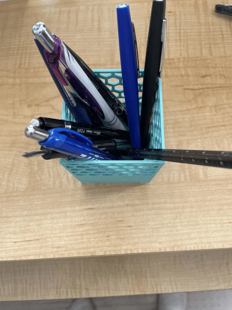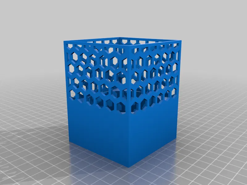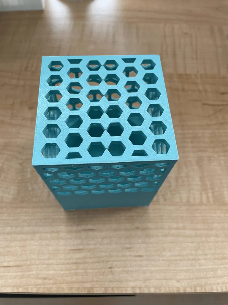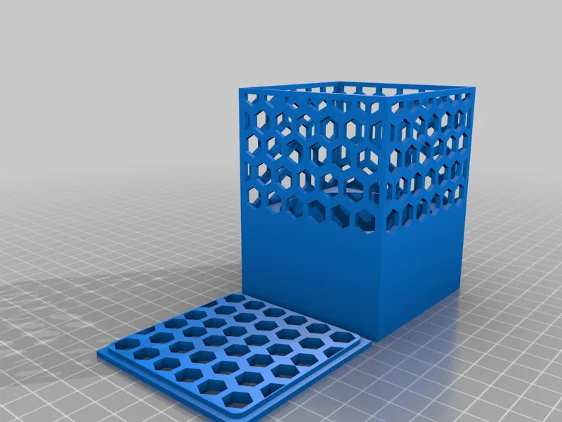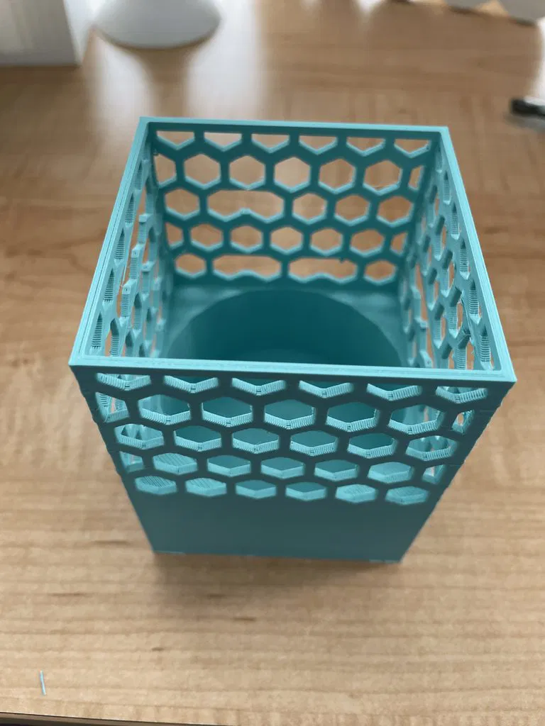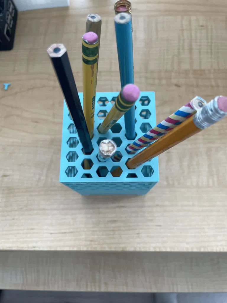 Cái này là cái cốc đựng bút chì hình lục giác, có thêm cái nắp để sắp xếp bút chì cho gọn hơn nữa đó. Lưu ý là cái nắp chỉ vừa với bút chì thường thôi nha, còn đa số bút mực và bút chì bấm sẽ không lọt qua mấy cái lỗ đâu. Nhớ canh chỉnh máy in cho thiệt thẳng nha không thì mấy cái cọng nhỏ nhỏ nó gãy hết đó.