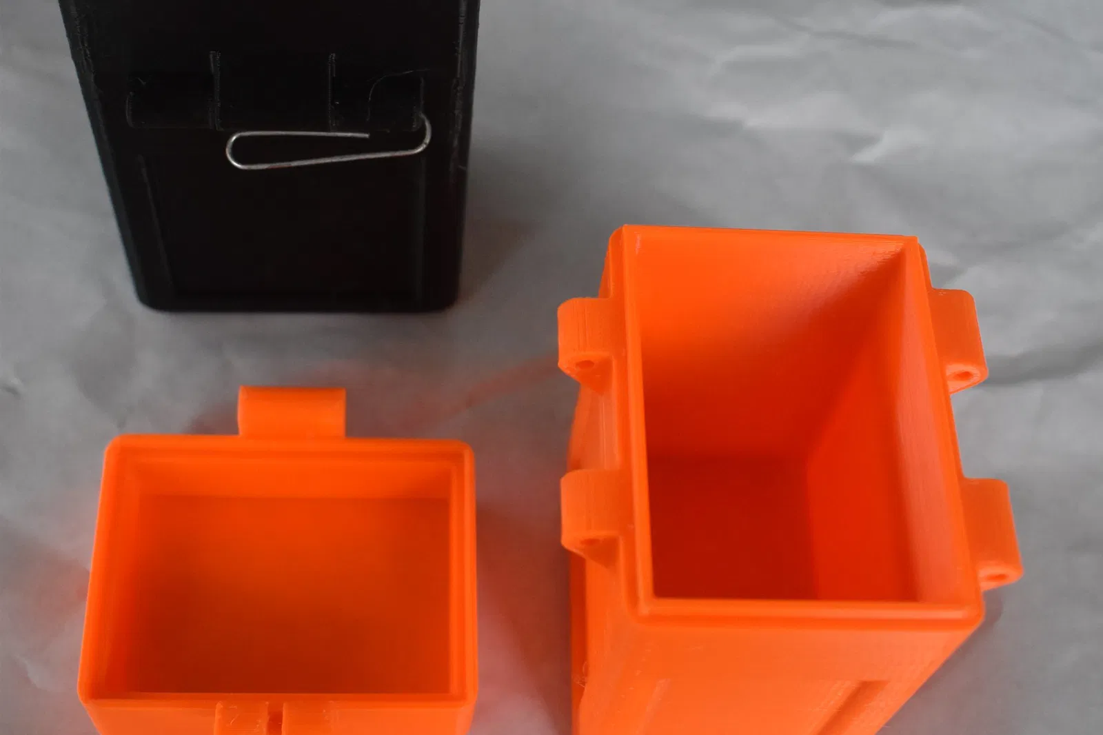 Tôi không muốn sử dụng chốt. Tôi đã cắt cả nắp & cái hộp theo chiều dài, phản chiếu các nửa bản lề và kết hợp các nửa lại với nhau. Đối với các chốt bản lề, tôi đã sử dụng vít 4-40 x 1-½" và đã rãnh một trong các bản lề nắp để có thể sử dụng một đai ốc giúp giữ vít bản lề. Bạn có thể sử dụng một kẹp giấy/kẹp tóc để giữ nắp đóng nhưng khớp ma sát đủ chặt cho cái hộp khi đã được nạp nằm nghiêng hoặc thẳng đứng.