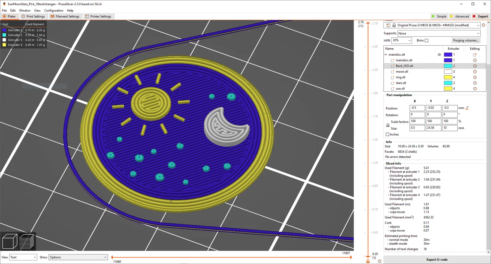 Một bản in thử nghiệm MMU nhanh chóng, đĩa tròn với họa tiết Mặt Trời, Mặt Trăng và Sao. Thiết kế nhiều màu sắc, có 18 lần đổi màu và chỉ mất 30 phút để hoàn thành. Thích hợp để kiểm tra chức năng MMU.
