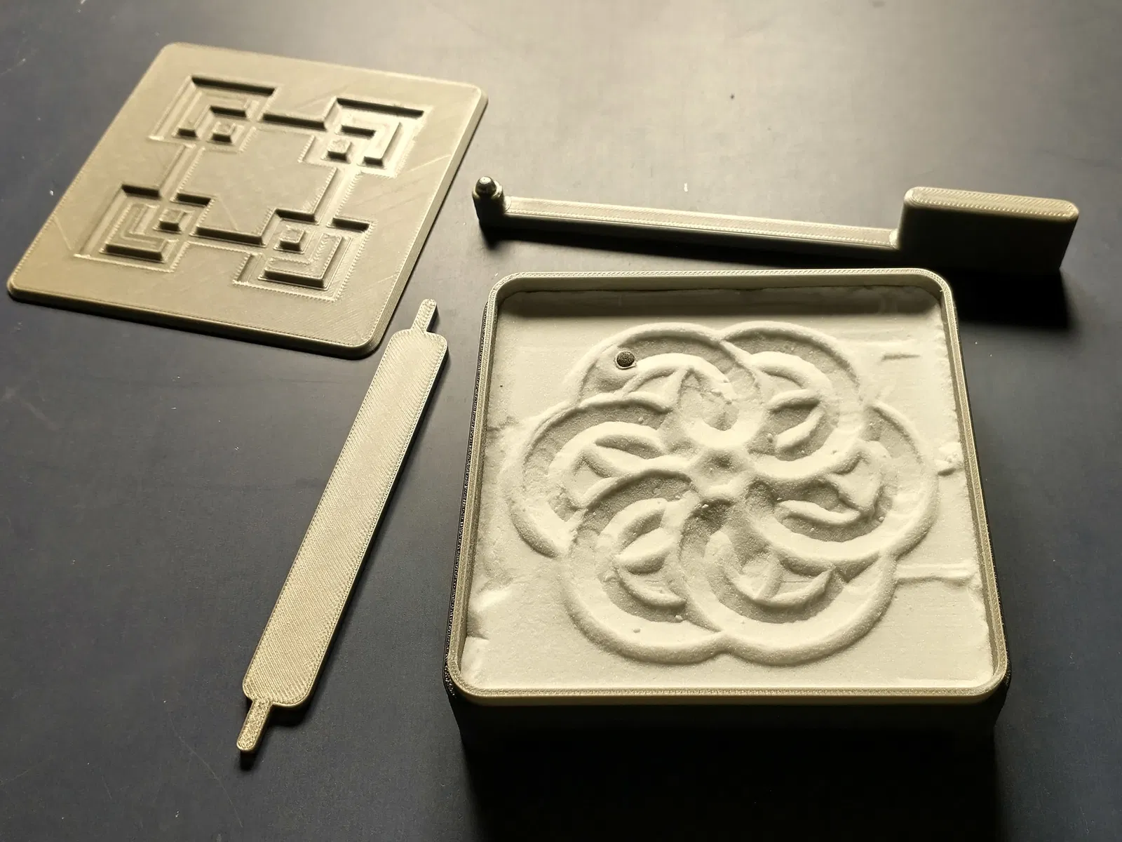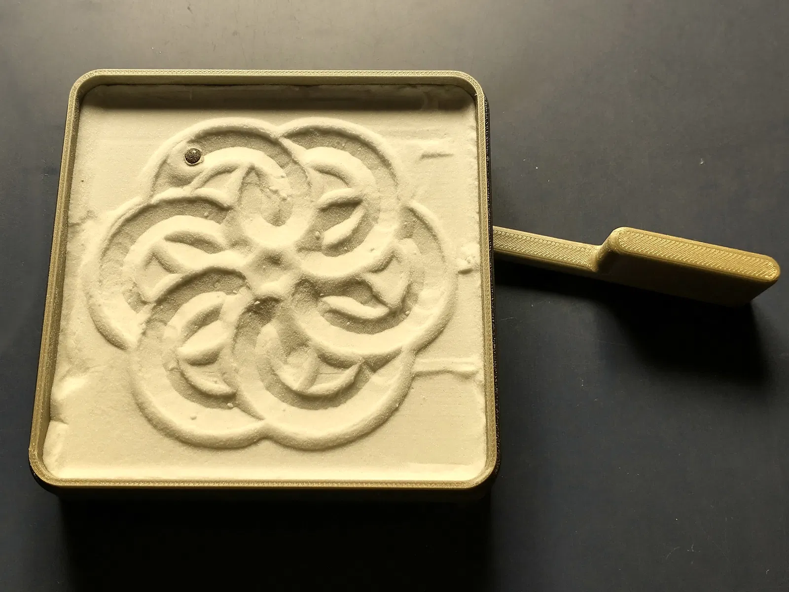 Cuối cùng, tôi đã bao gồm một dụng cụ san phẳng có thể dùng để làm phẳng cát. Nó có hai độ sâu khác nhau để tạo ra các hiệu ứng khác nhau. Với lớp cát mỏng (khoảng 2.5mm), viên bi sẽ lộ ra và bạn có thể tạo ra các hình dạng sắc nét hơn. Với lớp cát dày hơn một chút, khoảng hơn 5mm, cát sẽ che phủ viên bi, nó sẽ di chuyển bên dưới bề mặt như một con sâu cát Arrakis. Điều này để lại một hoa văn tinh tế hơn.