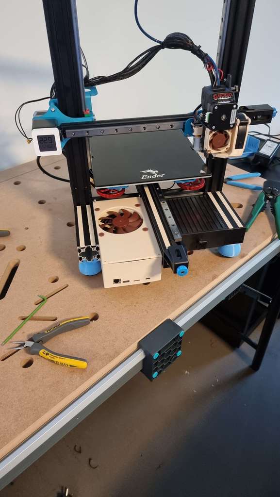 Dùng ốc ren cấy để gắn nắp, T-Nuts cho hai bên khớp với v-slot. Hỗ trợ quạt 92mm. Cần chân đế cao hơn. Thiết kế cho đầu phun 0.6mm. Infill 38%, không cần Rafts/Supports.