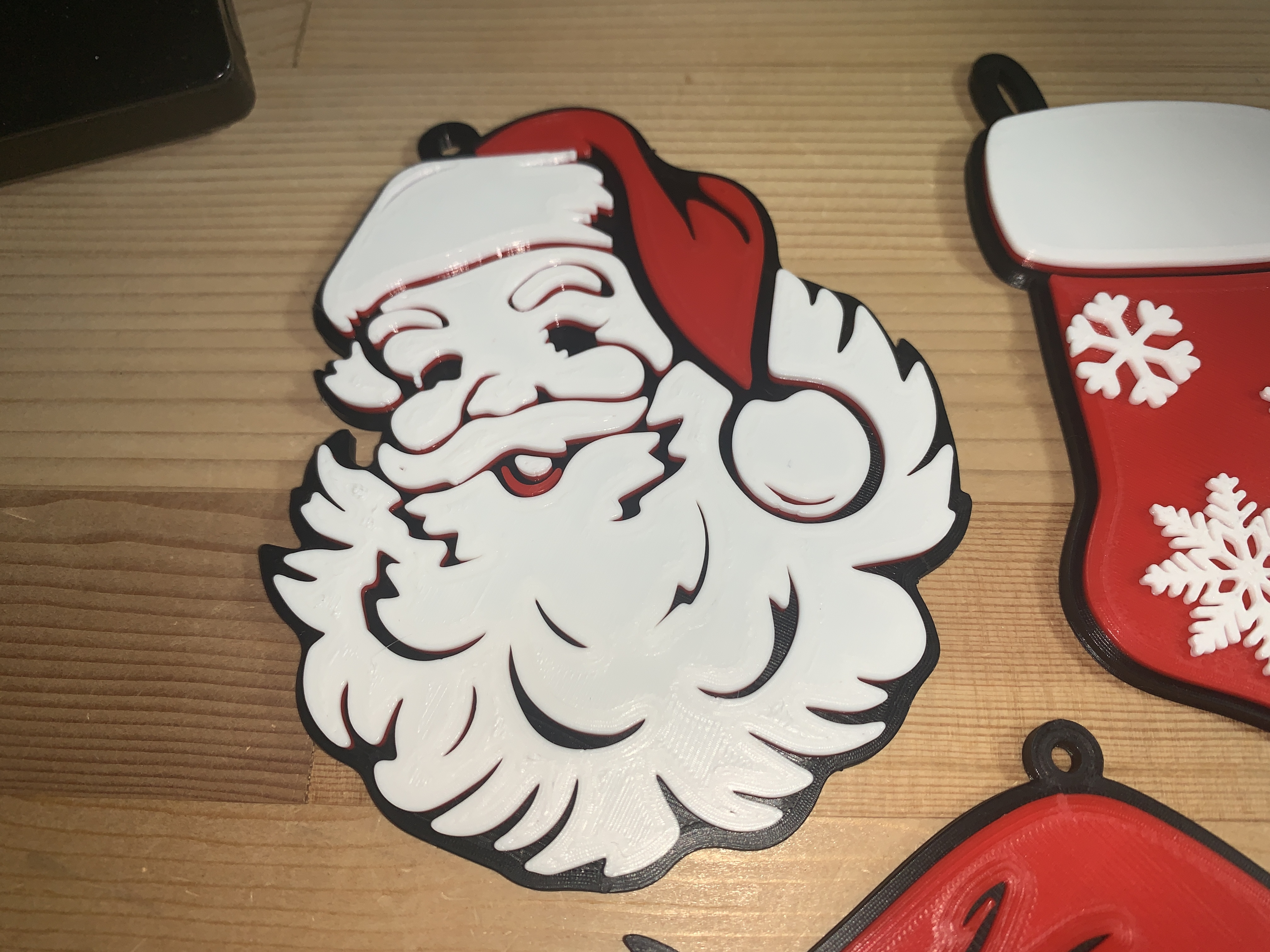 Móc treo cây thông Noel Ông Già Noel. In nhanh, 3 màu (thay màu ở các lớp khác nhau) với sợi màu đen, đỏ và trắng. In nhanh, có lỗ treo để móc lên cây thông Giáng sinh. Món quà nhỏ hoàn hảo. Được thiết kế có cùng màu lớp/thay đổi màu như các đồ trang trí khác của tôi để cả 3 (Mũ Ông Già Noel, Vớ và Ông Già Noel) có thể được in cùng nhau.