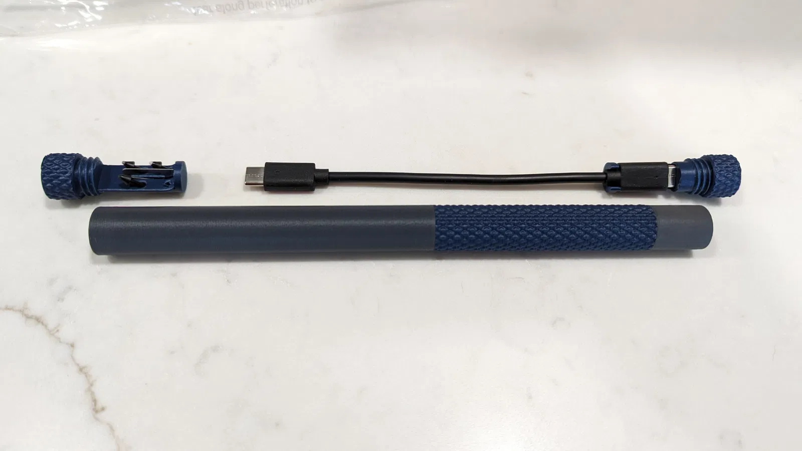 Có 4 món lận, làm vậy cho dễ in hơn đó. Hai khúc ống là thân chính, rồi có 2 cái nắp chụp cho mỗi đầu. Một cái nắp làm chỗ để cọng cáp USB-C, dễ rút ra rút vô cái ống, còn cái nắp kia thì để mấy cái đầu bút với dụng cụ tháo. Có làm mấy cái vân xoắn trên mấy chỗ cần vặn lại để cầm cho chắc cú hơn nha! Cả cái hộp này bỏ vô cái khoen đựng bút trên ba lô là vừa luôn.