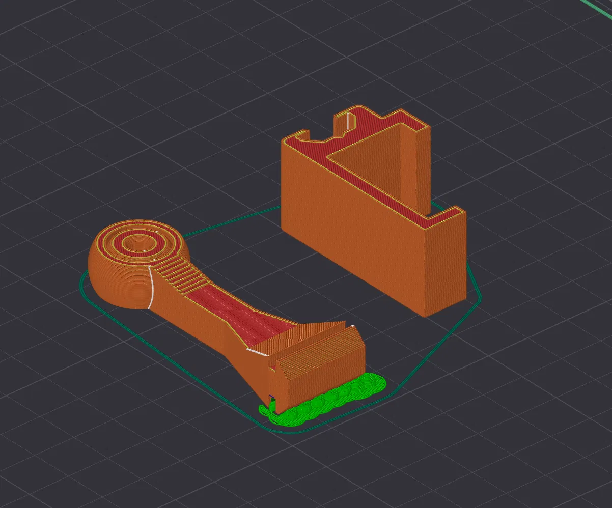 Cái này về cơ bản là làm lại cái nhưng mà có cái đế gắn chắc chắn hơn. Như đã nói ở trên, tui khoái cái đầu dẫn dây tóc dạng khớp cầu này lắm, nó vừa hay vừa hiệu quả. Nhưng mà cái đế gắn của mẫu kia thì không ngon lắm, tui phải dán keo vô thì nó mới chịu ở yên, chứ không thì nó cứ lung lay hoài. Vì vậy, tui muốn làm cái đế nào nó xịn sò hơn. Đó là lý do mà tui thêm mấy cái ray nhôm 2020 vô mấy cái đế kèm theo đây nè. Mấy cái ray gắn kiểu kẹp vô này là tui lấy y chang từ cái mẫu kia qua luôn. Nhớ nha, cái đế loại mà gắn cứng á, nó khít lắm đó. Tui phải gõ nhẹ hai cái phần đó mới ráp lại được, nhưng mà đúng là cái kiểu khít khao mà tui mong muốn. Còn nếu muốn lỏng hơn, thì bạn có thể chọn loại ray gắn lỏng hơn, thử chỉnh lại dung sai (tolerance) trong slicer, hoặc thậm chí scale nhỏ cái mẫu đầu dẫn dây tóc này lại một chút. Để có kết quả tốt nhất, in với cái đầu dẫn dây tóc úp xuống và dùng supports dạng cây (tree supports) cho phần ray, giống như trong hình nha. Dùng supports bình thường cũng được, nhưng mà gỡ ra khó chịu lắm.