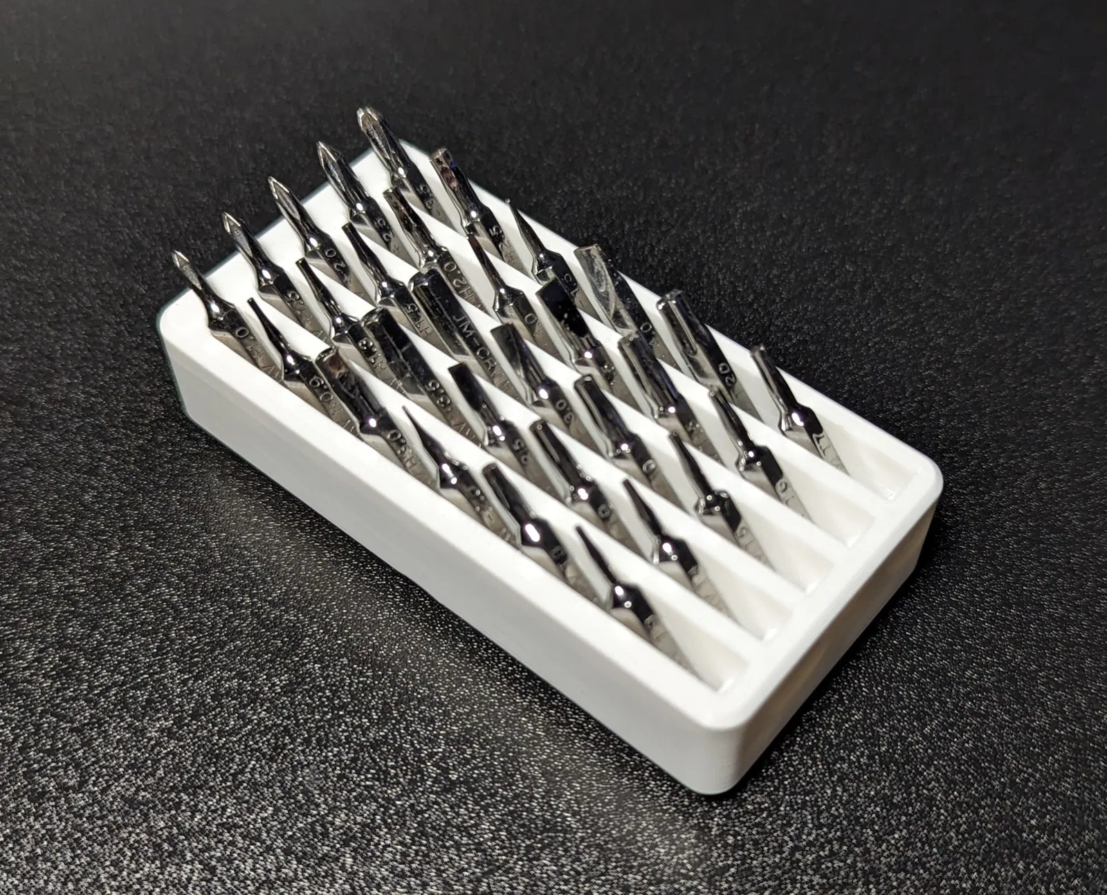 Giá đỡ mũi tua vít 4mm Gridfinity. Mô hình này là đế Gridfinity 2X1, có thể chứa 30 mũi tua vít, theo cấu hình 6X5 mũi. Tôi thiết kế cái này để nó càng nhỏ gọn càng tốt, nhét càng nhiều mũi tua vít vào ô vuông 2X1 càng tốt. Các mũi tua vít được đặt hơi nghiêng để trình bày đẹp mắt và giữ chúng cố định nhưng vẫn dễ lấy. Dù nhỏ gọn, tôi thấy việc lấy mũi tua vít vẫn rất dễ dàng. Tôi chỉ cần đặt một phần ngón tay dưới đầu mũi tua vít, nghiêng nó lên một chút, sau đó bóp và rút nó ra.