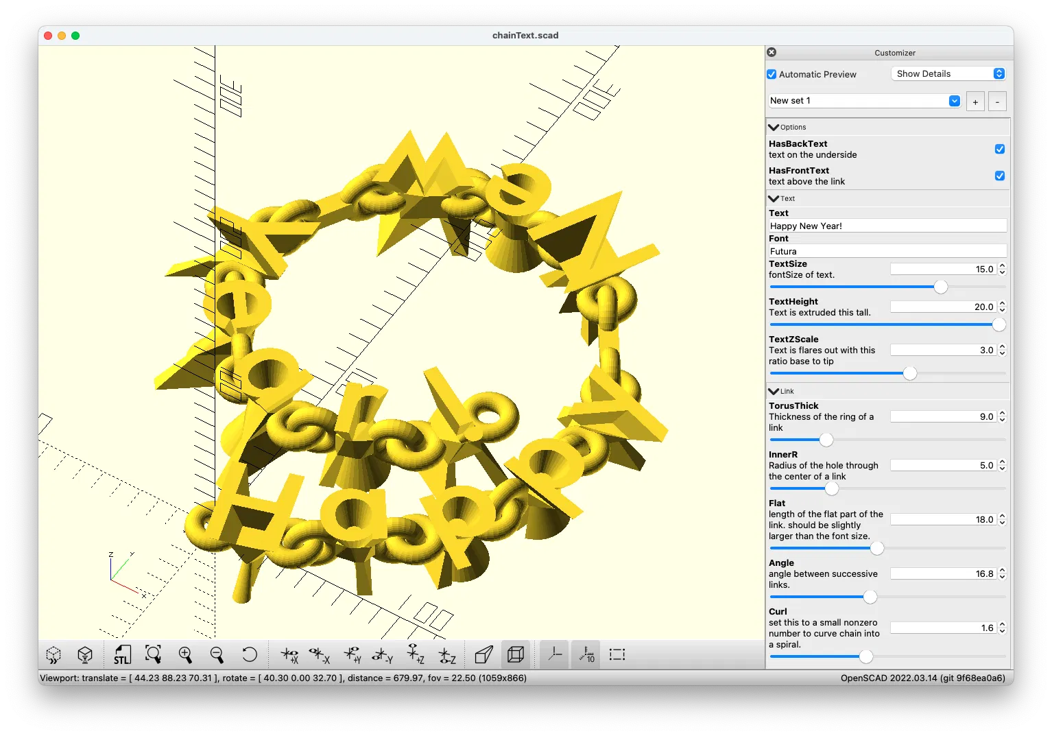 File chainText.scad chỉ là 1 file text thôi, bạn có thể sửa nó bằng bất kỳ trình soạn thảo văn bản nào, không nhất thiết phải là trình soạn thảo của OpenSCAD. Trong đó có 1 dòng comment là HasBottom = false; bỏ comment nó đi, nó sẽ cắt thiết kế tại mặt phẳng Z=0, để bạn có thể thấy bên trong của các mắt xích.