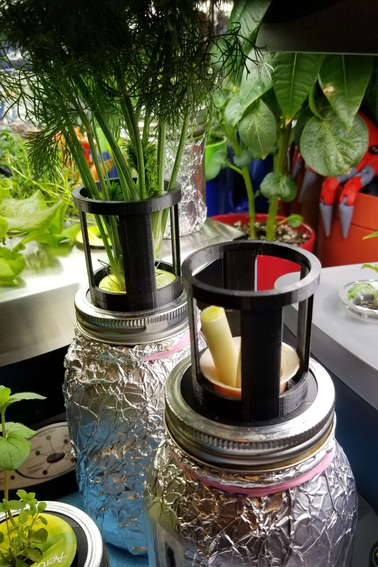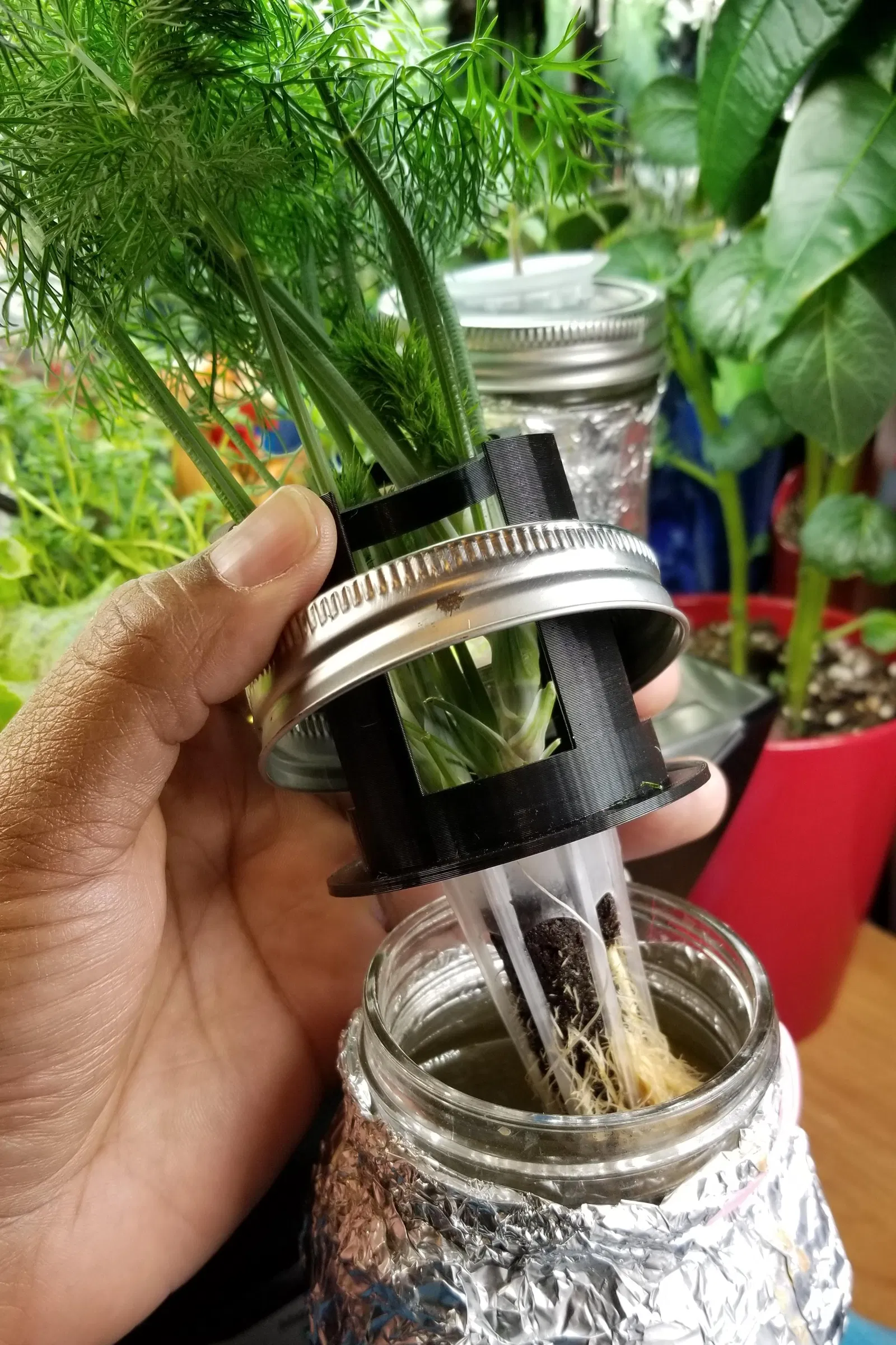 AeroJar với đế đỡ cây, dùng với cốc lưới aerogarden và lọ mason miệng nhỏ. Thích hợp cho thủy canh phương pháp Kratky. Hướng dẫn in chi tiết kèm cài đặt khuyến nghị.