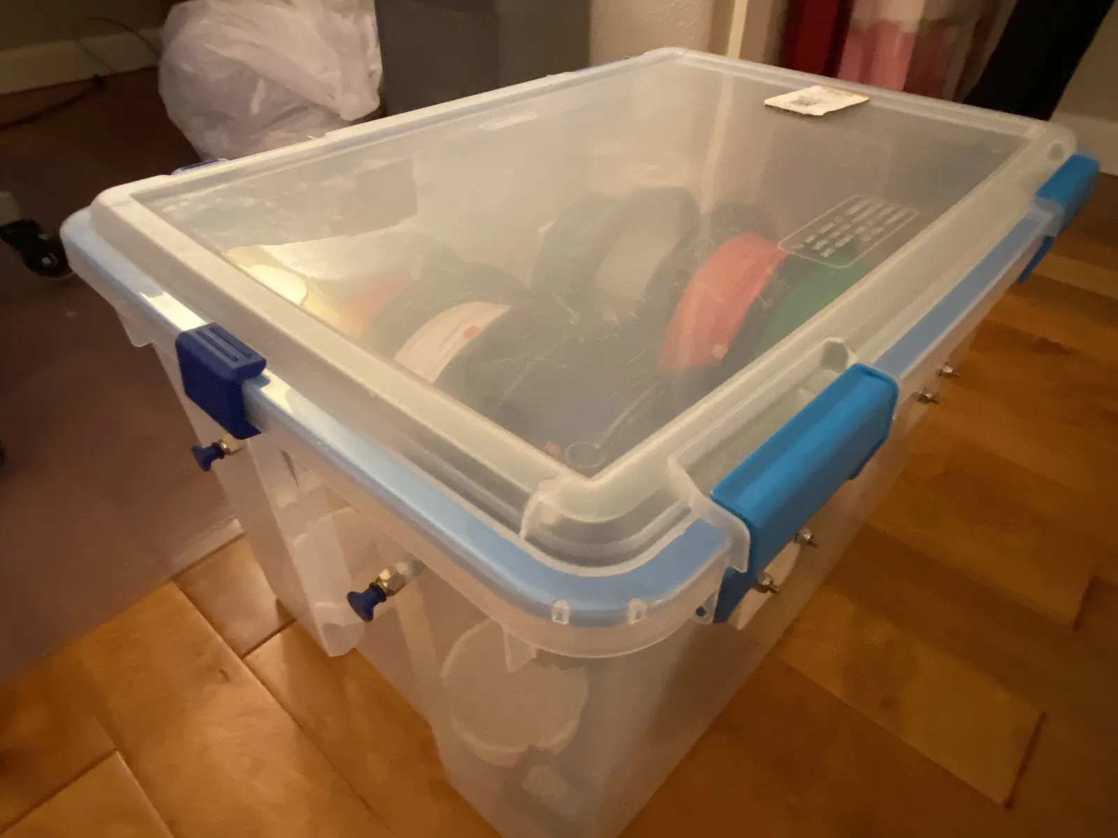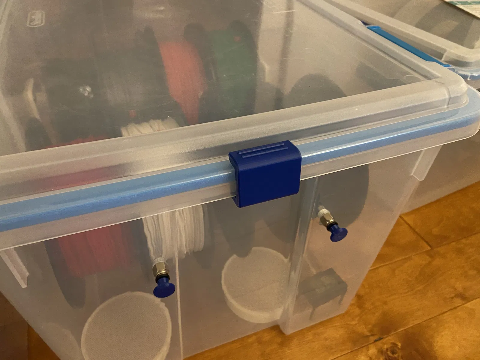 Tôi có thùng Sterilite dung tích 54 và 32 quart mà tôi dùng làm hộp chống ẩm và muốn có kẹp cho hai đầu thùng. Tôi để ý thấy gioăng ở hai đầu hầu như không được ép chặt lắm. Mấy cái kẹp này đã giúp ích khá nhiều và cũng có thể dùng thay cho chốt nắp bị gãy ở hai bên hông. Không có gì quá cầu kỳ đâu, nhưng tôi nghĩ nên chia sẻ để ai đó có thể thấy hữu ích.