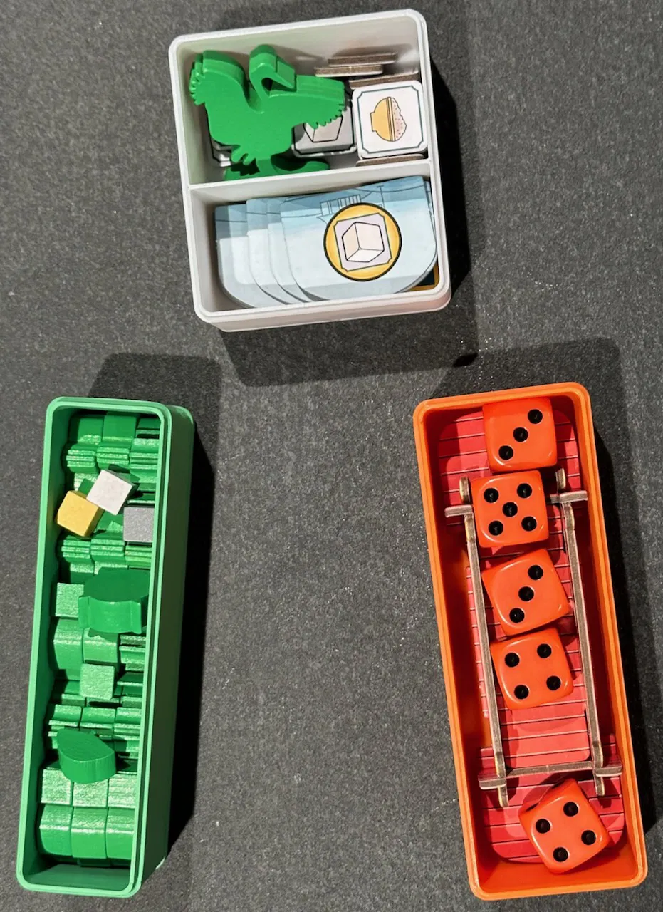 player_box_v2.stl, player_box_v2_lid.stl - Chứa tất cả các meeple và marker của người chơi, trừ quân heron. In bốn bộ hộp/nắp cho mỗi loại, mỗi bộ một màu cho người chơi (nếu bạn muốn). Bạn có thể in một bộ hộp/nắp cùng nhau trên cùng một mâm in.