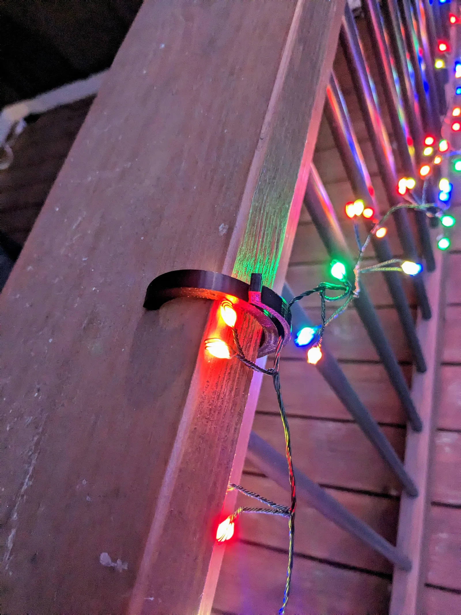 Vợ tui muốn kiếm cách nào đó gắn đèn xmas lên lan can trước nhà cho nó lẹ mà dễ nữa. Bà ấy kiếm được mấy cái kẹp nhựa trên mạng, mà tui nghe xong là tui la liền “tui làm còn ngon hơn nữa!” Tui tự vẽ cái kẹp này từ đầu trên tinkercad luôn. Chỉ cần bẻ cong nó chút là gắn được lên lan can hoặc bất kỳ miếng gỗ nào có kích thước 2x4 (thực tế khoảng ~1.6 inch hay ~40mm).