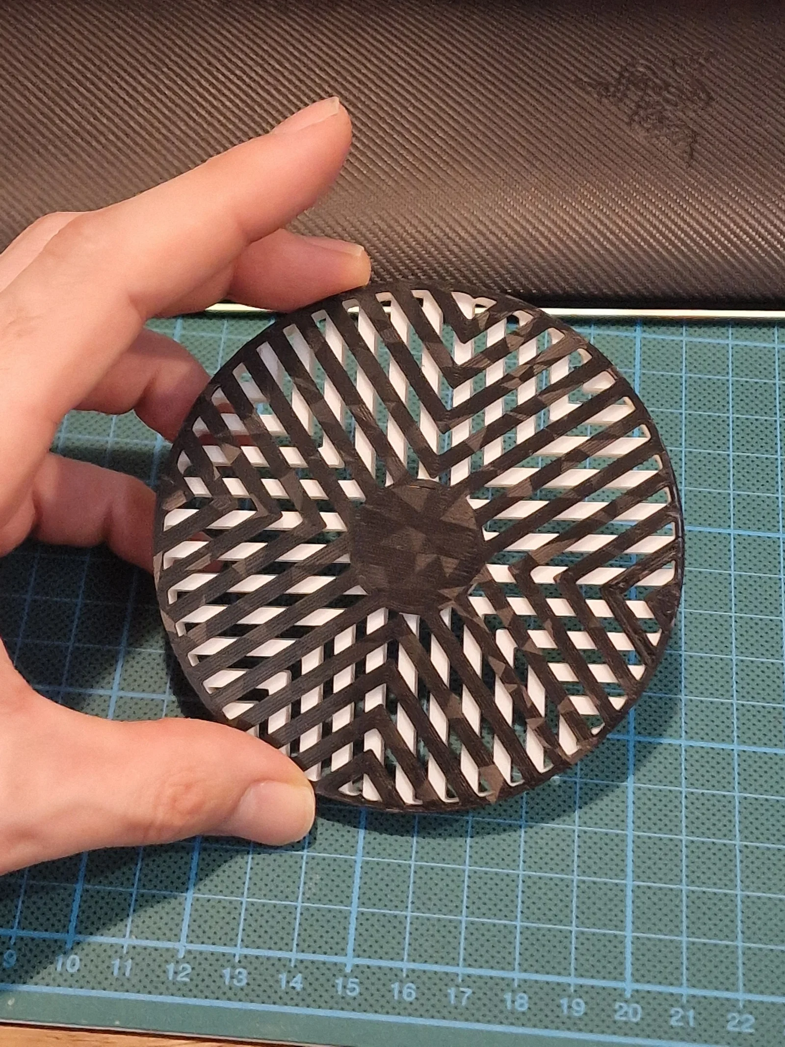 Đế lót ly xoay tạo ảo ảnh quang học độc đáo. Lấy cảm hứng từ mẫu hiệu chuẩn PA khi in thử nghiệm. Mô hình này cần vòng bi 608 và có dung sai 0.1mm, phần ngoài vòng bi vừa khít, phần bên trong cần keo để cố định.