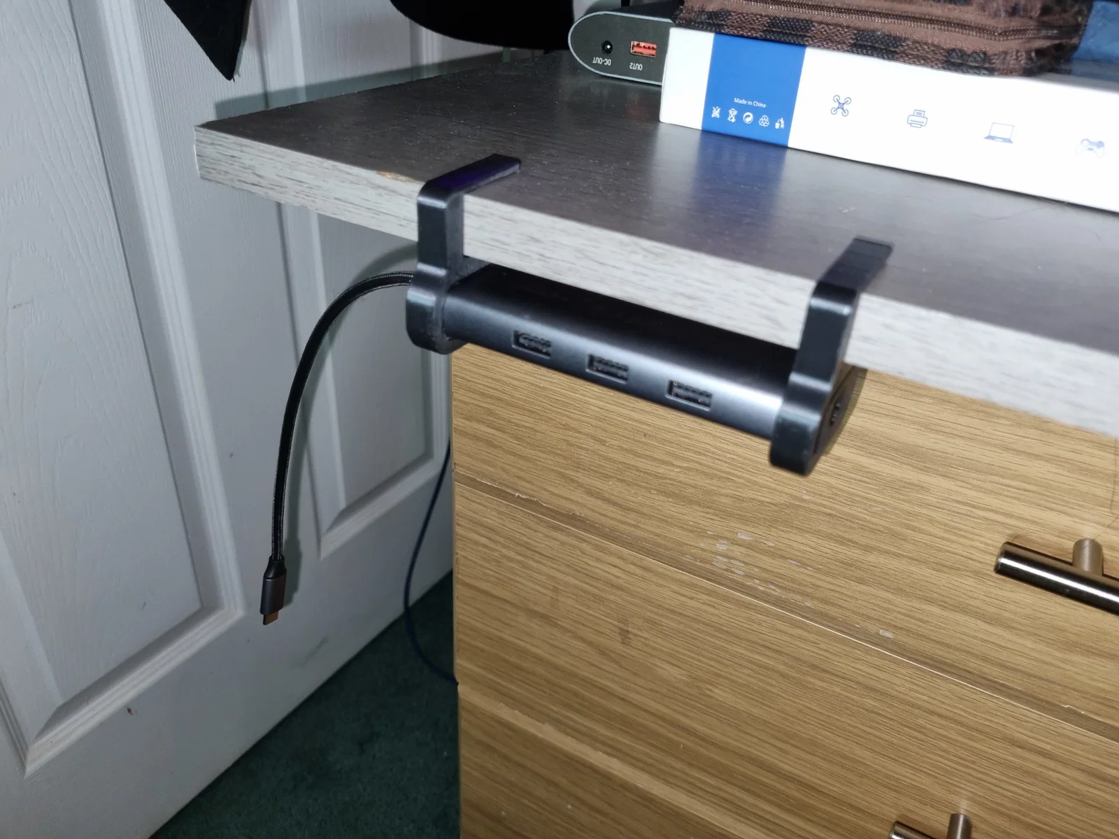 Móc treo bàn để giữ UGREEN Revodok CM512 trên bàn có độ dày 18mm. In ra 2 cái, trượt vào hai đầu dock và treo lên bàn là xong, gọn gàng liền!