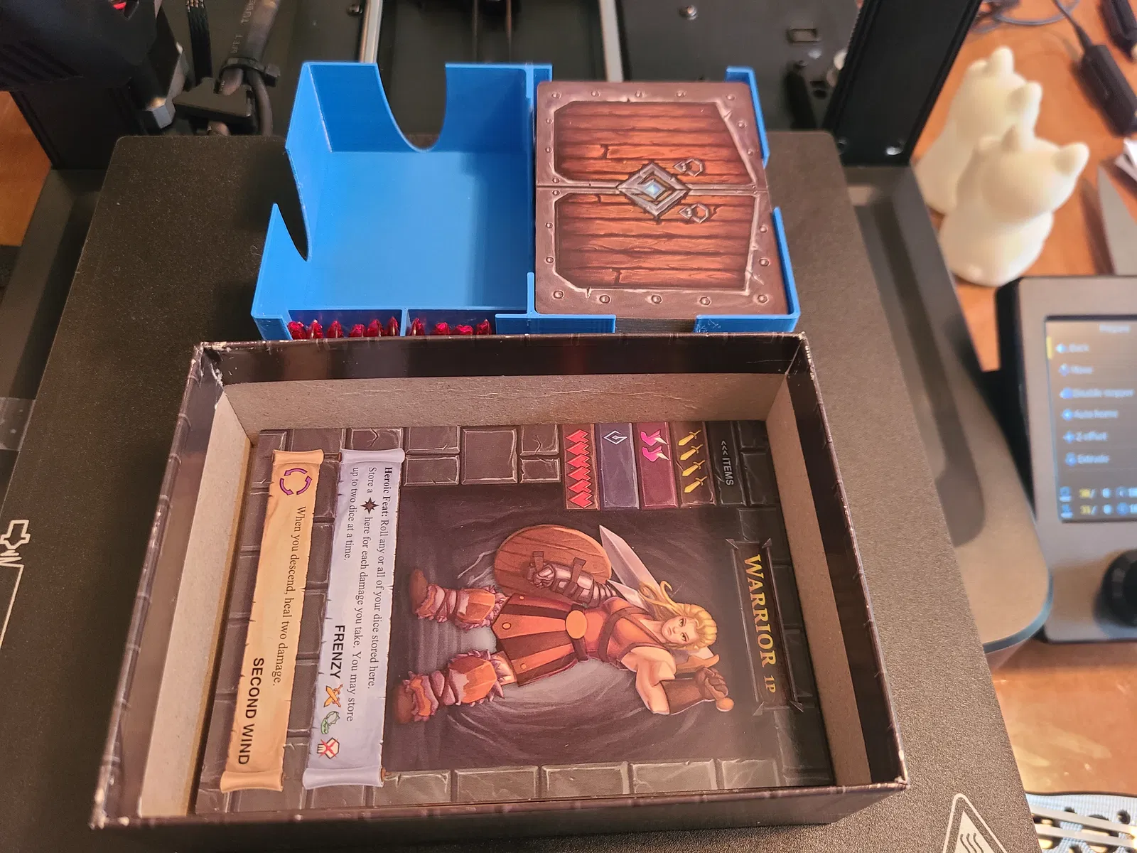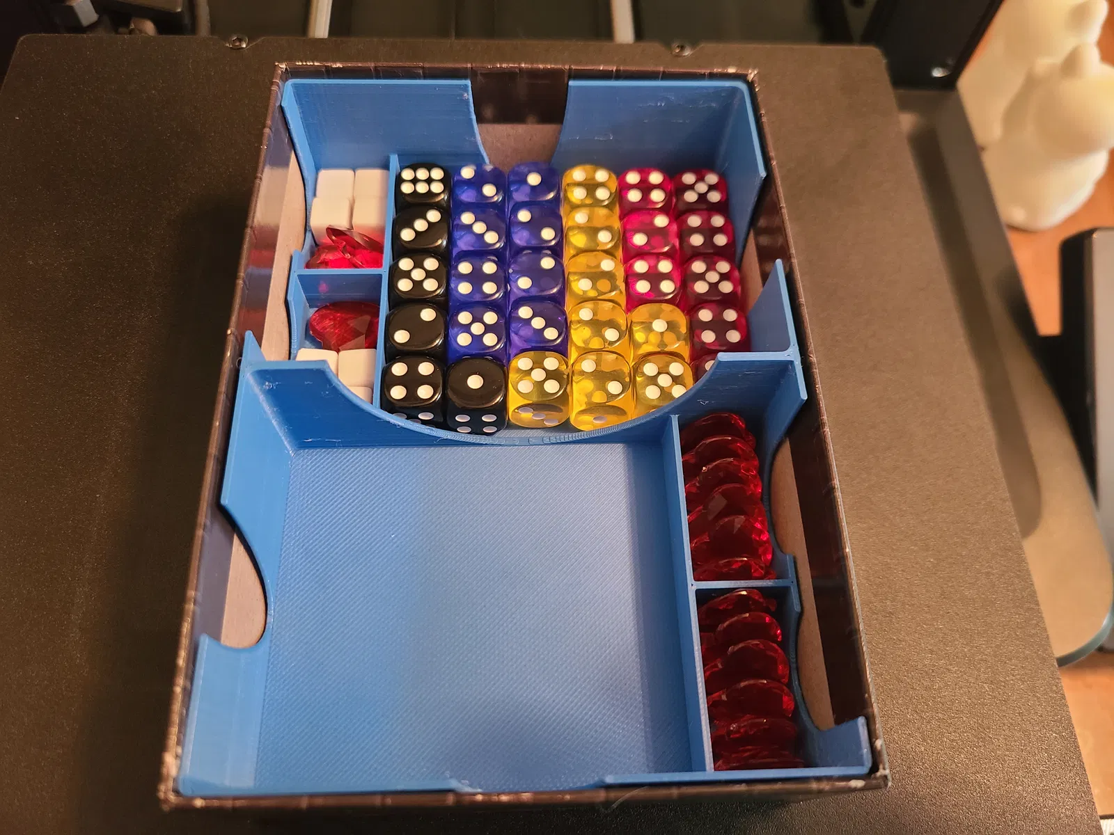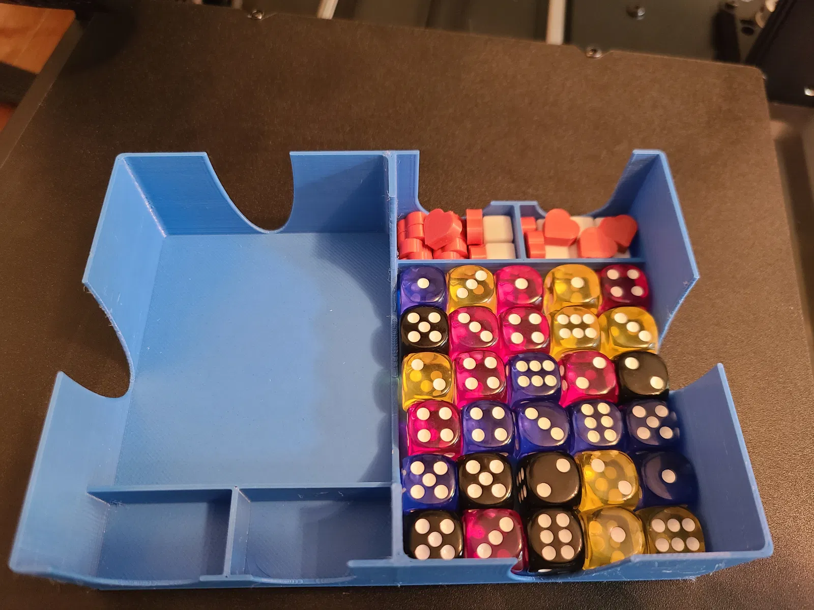 Khay đựng cho One Deck Dungeon bản US, kèm theo hạt tim nhỏ gọn. Giúp bạn sắp xếp gọn gàng Dice, Hạt tim, Bình thuốc, Thẻ và Sách trong một hộp duy nhất. Phiên bản chỉnh sửa đã giảm độ cong sau lần in đầu.