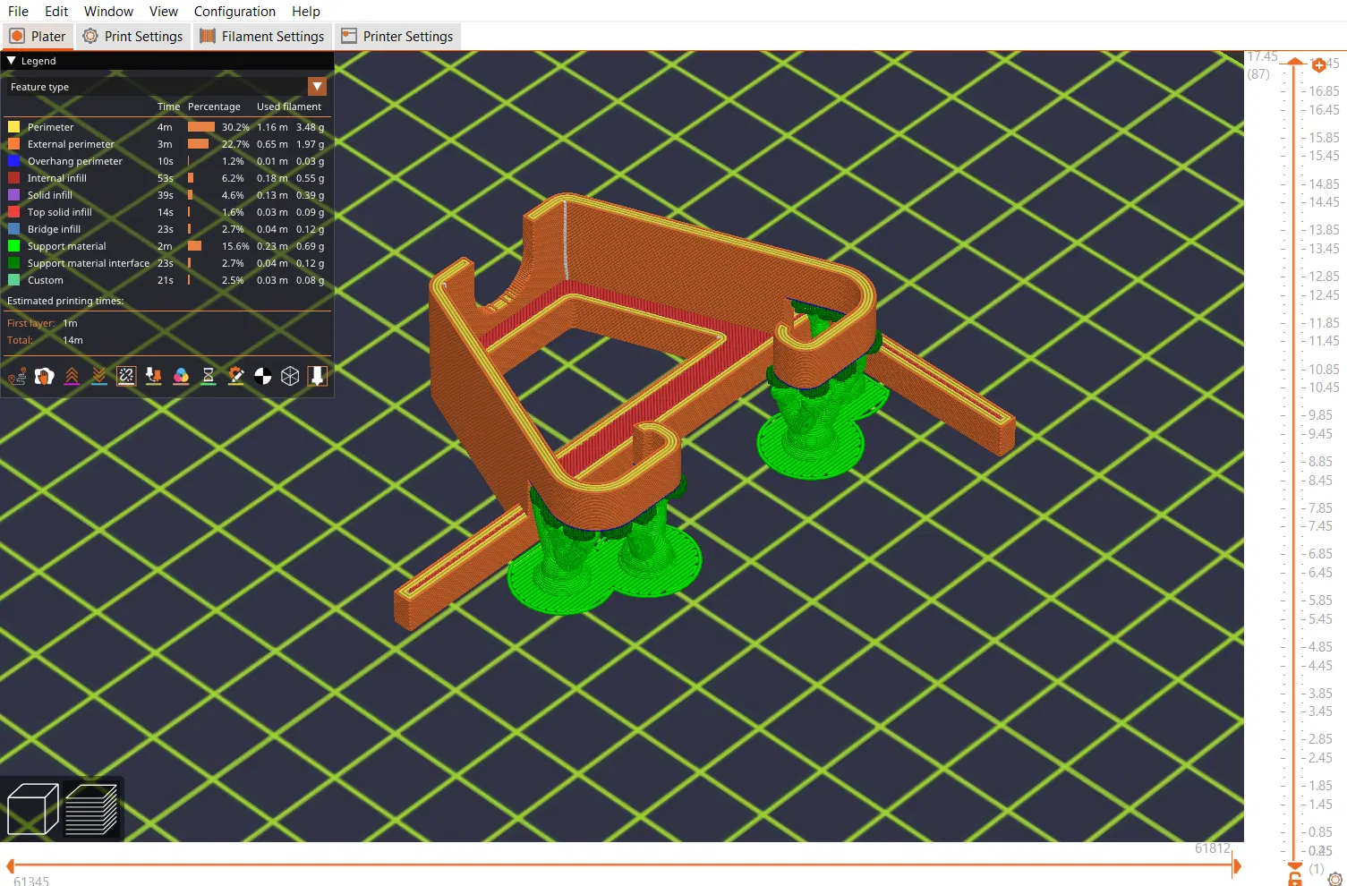 Tui cũng tự tay thêm support vô file 3mf cho Prusa Slicer, kèm theo cài đặt để việc gỡ support (tương đối) dễ dàng. Tui cố gắng làm cho cái "hàng rào" của cover càng thấp càng tốt mà vẫn đảm bảo việc canh chỉnh dễ dàng.